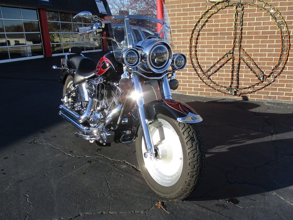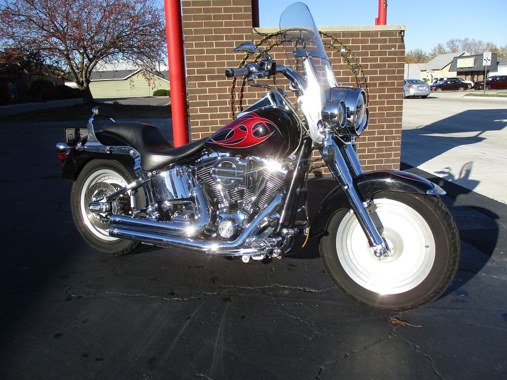 With its fat FL forks, wide 16 tires, broad handlebars and chrome 7 headlight nacelle this softail is anything but skinny. Its distinctive look will get you noticed in a crowd. The 2002 Fat Boy has a 1450cc Twin Cam V-Twin mated to a 5 speed manual transmission. You will also appreciate the driver floor boards, solid disc wheels, FL rear fender and the optional fuel injection which this bike is equipped with. This particular example has also been nicely upgraded with a long list of chrome which includes the rear swing arm, front forks, axle covers, frame inserts, swingarm bolt covers, upper and lower belt guards, shift levers, hand levers, horn cover, switch housing covers and chrome fender tips with gold H-D Eagles. It has a full custom paint job with custom tribal graphics, Daymaker LED headlight and passing lamps, smoked turn signals, a sweet low profile H-D seat with custom stitching, a matching QR passenger backrest, a QR windshield, Carlini beach bars, upgraded floor boards with a matching brake pedal, matching grips and pegs, flamed mirrors as well as flamed covers for the master cylinder, inspection cover and primary cover. To top it off it has a Stage I Hyper Charger and it sounds just plain nasty ripping through its Vance & Hines Short Shot performance exhaust system. Less than 1,000 miles ago it received new tires, brakes and a battery. Within the last 5 miles it was fully serviced and inspected and everything is in perfect working order. We have priced it fairly