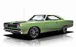 Power comes from a modern 6.1L Hemi V8 built by Arrington Performance, producing more than 525 horsepower. Electronic fuel delivery is handled by a Holley Sniper EFI system. A Tremec TKO500 5-speed manual transmission sends power to a Chrysler 8.75" rear end equipped with 3.91 gears and a limited-slip differential. The chassis combines a torsion-bar front suspension with a 4-link rear setup and coilover shocks, creating a stance and handling profile consistent with serious pro-touring builds. Stopping power comes from four-wheel Baer brakes with drilled and slotted rotors, assisted by a Hydratech power brake unit. Long-tube headers feed a stainless dual exhaust system with an X-pipe and chambered mufflers, exiting through custom tips integrated into the rear valence. Polished Bonspeed wheels, 18" up front and 20" in the rear, are wrapped in Nitto performance tires to complete the car's aggressive stance.