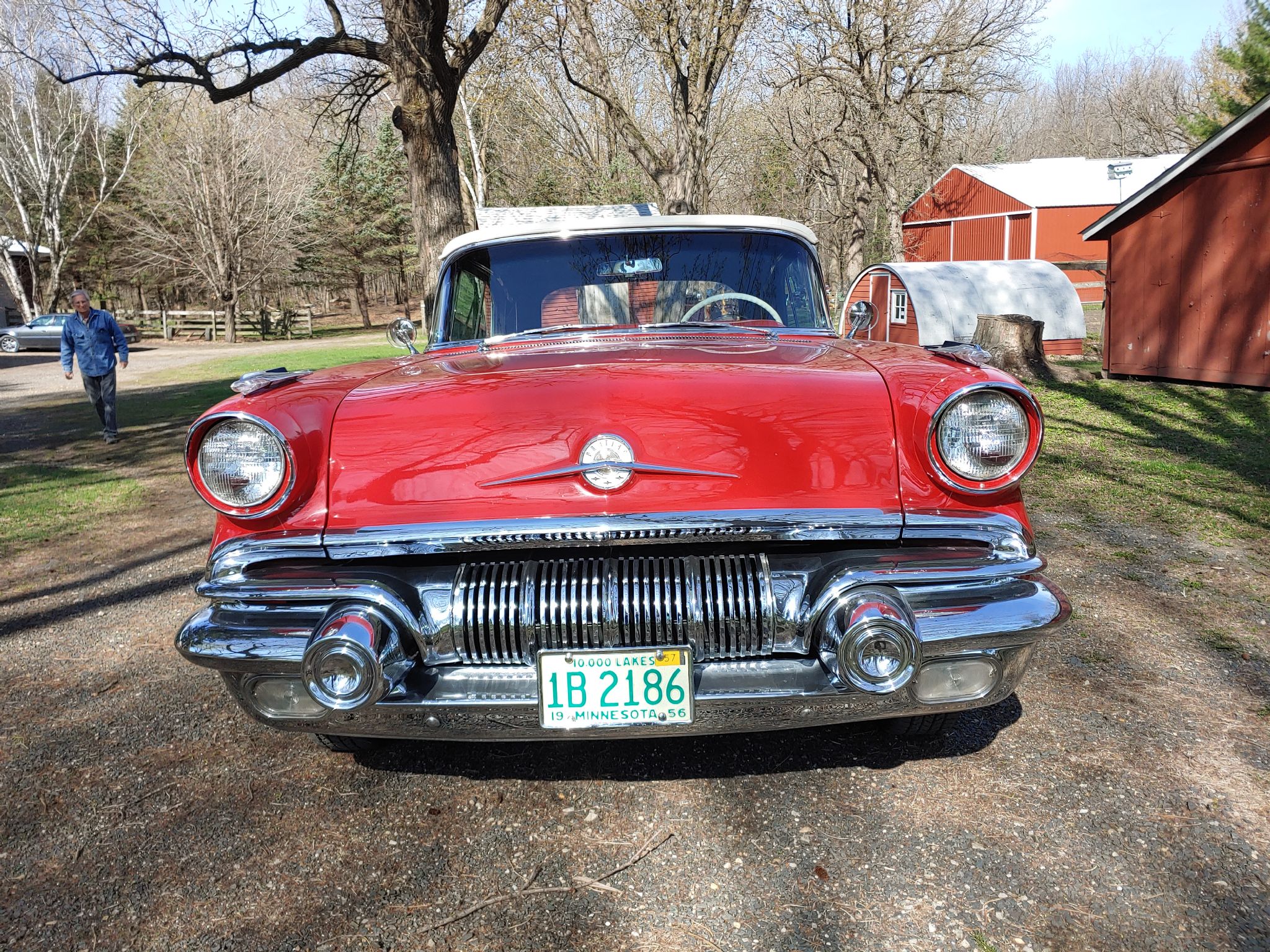 Tartan Red and White, power White soft top, vinyl Red/White interior, 347ci, 3 carb, 4 speed automatic transmission, Continental kit, radial tires, 3 bar spinner hubcaps, PB, AM/FM radio, power seats, power rear antenna, PS, PB, PW, dual exhaust, fender skirts, Kleenex holder, heater, tinted glass, dual o/s mirrors, electric windshield wipers, electric clock, back up lights, license plate chrome, glove box manual, 1400 miles since frame off restoration. George McNeilus 507-269-9870.