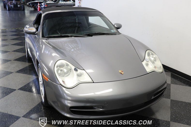 German engineering at its finest appears before you in this 2002 Porsche 911 Carrera 4 Cabriolet, coated in a crisp Seal Gray Metallic that accentuates every curve. The black canvas convertible top creates a bold contrast against the sophisticated gray paintwork, folding away to display the full visual impact of the 911's iconic design. Factory-fitted 18" Carrera 5-spoke wheels " upgraded from the standard 17-inch " anchor this performance machine to the road, with 225/40ZR18 front and 285/30ZR18 rear ZR-rated tires gripping every corner. The paint maintains gloss and depth throughout, with clean door jambs that reflect the German commitment to quality.