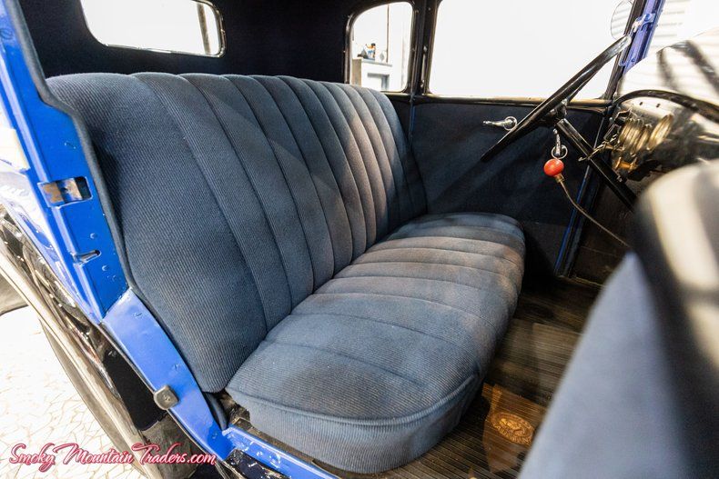 The body has been phenomenally cared for over the years and was redone in the Blue and Black color scheme, accented by the tan stripe down the sides. All the glass is in great condition, and the front windshield tilts out. Both front and rear bumpers are very nice as well. Up front we can see the grill and headlights are very nice, and out back, it has the spare tire and center brake light. It's sitting on the factory-style wheels with Goodyear tires. On the inside, it's done in classic blue with matching seats and door panels. It's got the factory-style steering wheel and rubber American Austin Floor mat. Looking at the dash, all the gauges and metal looks to be in great condition. Under the hood it's powered by the 4 Cylinder 750CC Flat Head Engine. It still has the 6 Volt system. It comes with the standard optioned 3 Speed manual.