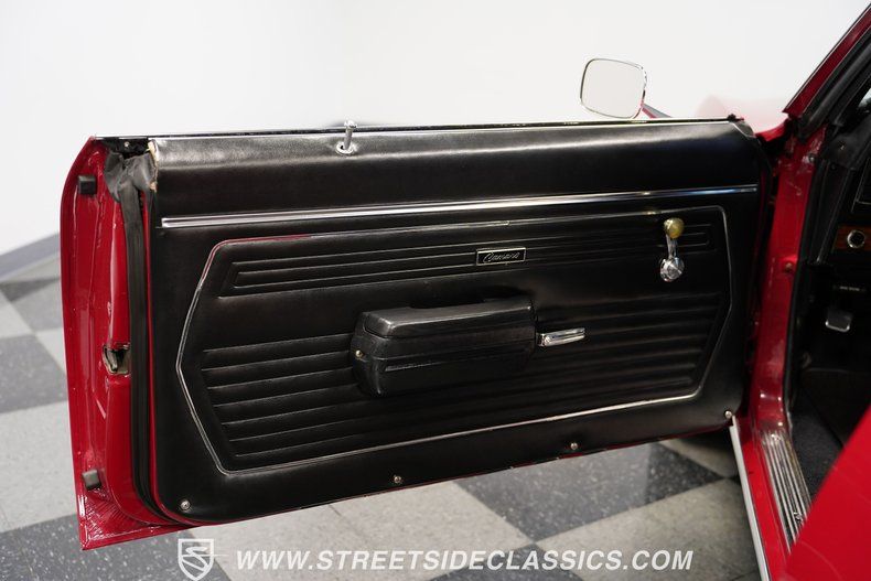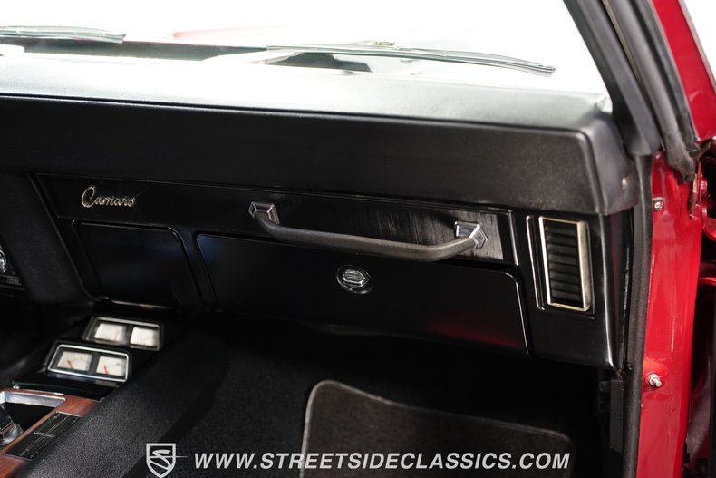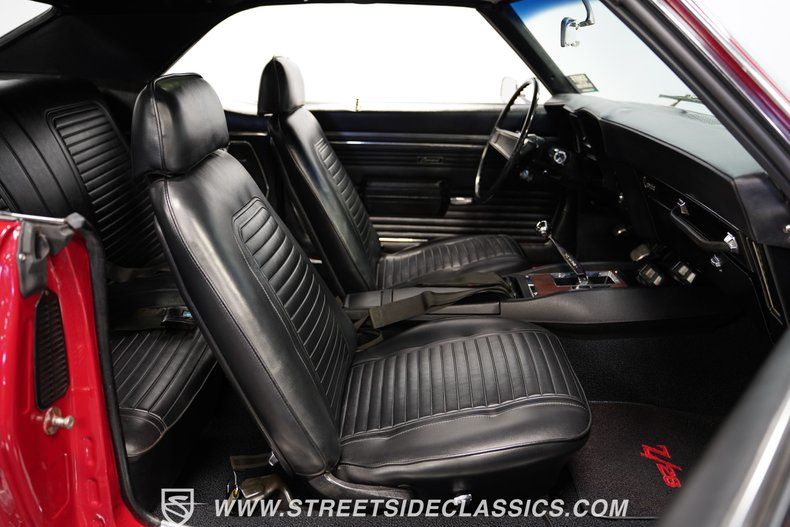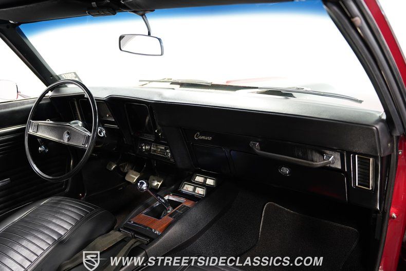 Fully restored with racing heritage, this 1969 Chevrolet Camaro Z28 wears Garnet Red paint accented by bold black racing stripes. The two-tone color combination gives this Z28 a classic muscle car look that GM perfected in the late 60s. Clean chrome bumpers and trim contrast perfectly against the glossy finish of the paint. Sitting low on 15" Crager SS wheels with 215/70R15 front and 235/70R15 rear tires, this Z28 has a planted, muscular stance that emphasizes its performance roots. Every body line shows the attention to detail that went into this Z28's full exterior restoration.