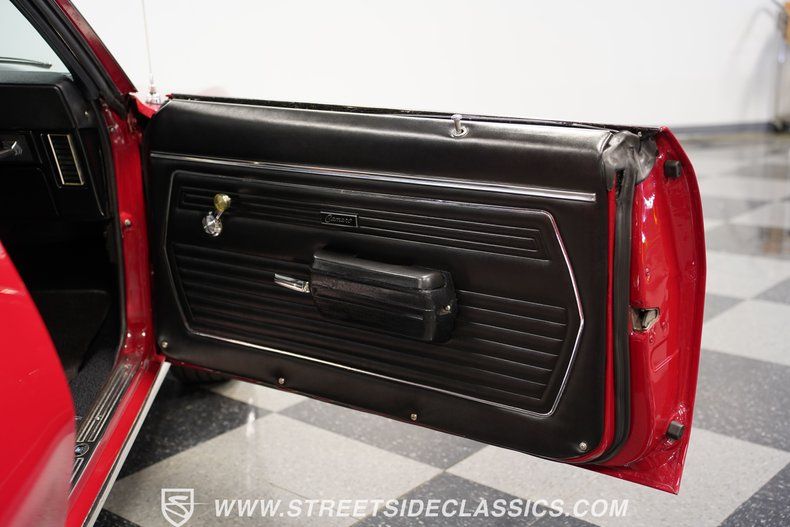 Black vinyl covers the bucket seats in the factory-styled interior of this Camaro. The console houses the Muncie shifter, positioned for quick gear changes during fast driving. An AM/FM cassette player sits in the dash, surrounded by factory gauges that display all vital information. Black carpet lines the floor, matching the door panels and creating a clean overall look. The black interior provides excellent contrast against the red exterior, giving this Camaro a cohesive design that GM executed so well on these performance models.