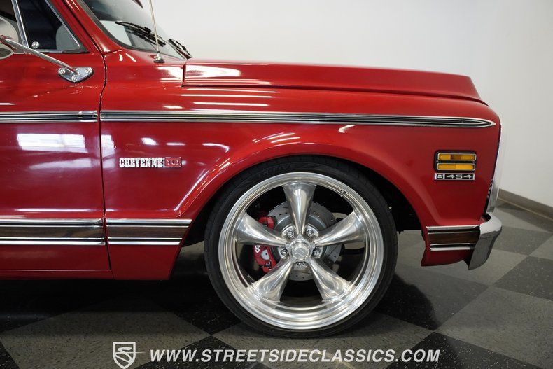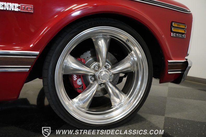 454 V8 Engine 700R4 4-Speed Automatic Transmission Edelbrock Single 4-Barrel Carburetor Pro Gear 3:42 Rear Axle CPP 13" Front Big Brake Kit CPP 12" Rear Brake Kit Drilled and Slotted Rotors Tubular Upper Control Arms New Lower Control Arms Steering Linkage Kit Front Coil Springs with 2" Drop Bolt-in C Notch in Rear Dual FlowMaster Exhaust Red Paint Billet Grille 22" American Racing Wheels 265/30ZR22 Front, 295/30ZR22 Rear Lionheart Tires Color-Matched Bedliner Black Interior with Contoured Bench Seat and Fold-Down Armrest Aftermarket Steering Wheel Alpine AM/FM/AUX Stereo with Bluetooth Air Conditioning Power Steering Column Shifter Rubber Floor Mats with Chevy Emblems