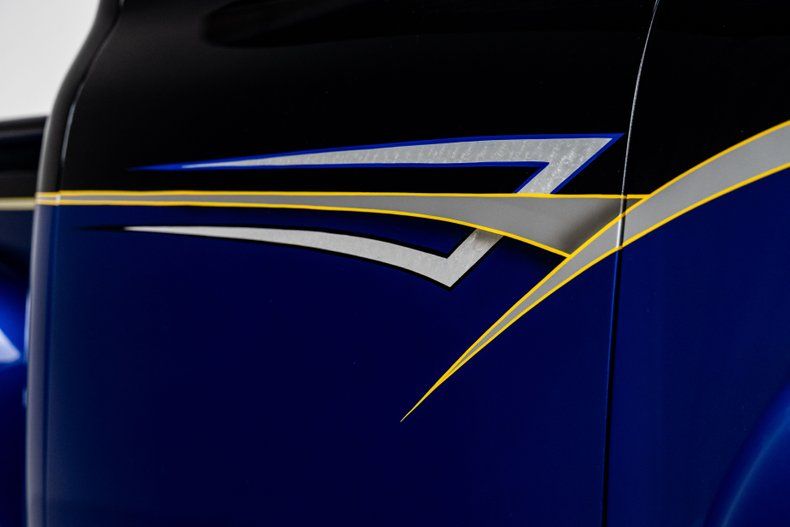 Once the metalwork was verified straight and true, the Roadster Shop laid down a two-tone Black and Blue metallic finish. The contrasting paint is detailed with silver leaf and gray gradient accents, bordered by crisp yellow pinstriping by Rick's Pinstriping. This finish extends into the engine bay, which was treated with the same level of detail and pinstriping.