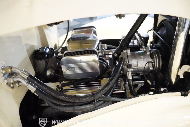 The 350 cubic inch V8 engine comes equipped with an Edelbrock 4-barrel carburetor mounted on an Edelbrock intake manifold. A 700R4 4-speed automatic transmission handles gear changes efficiently. The upgraded front suspension uses an independent setup with tubular upper and lower control arms, coilovers, and rack and pinion steering for responsive handling. At the rear, a 9" Ford axle with leaf springs and air shocks manages the load. With four-wheel power disc brakes and dual exhaust with street flow mufflers.