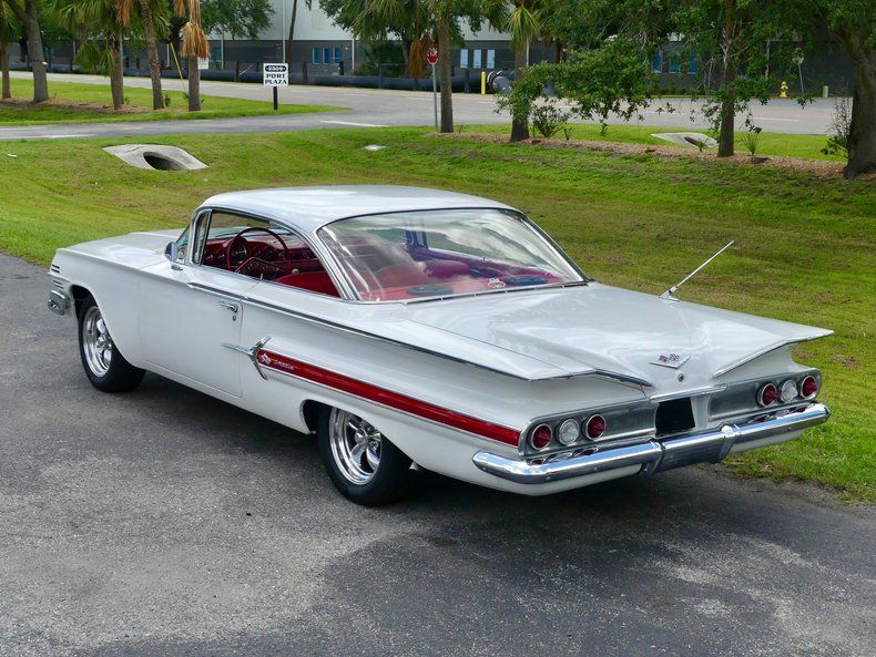 This Impala is finished in a fresh Ermine White paint job with lots of chrome trim and brightwork plus a beautiful red accent on the quarter panels. She sits on a sweet set of 17in American Racing Torq Thrust polished alloy wheels wrapped in low profile tires. Out back you will find what is arguably the best looking set of tail lights to ever grace an automobile. Also included are a set of