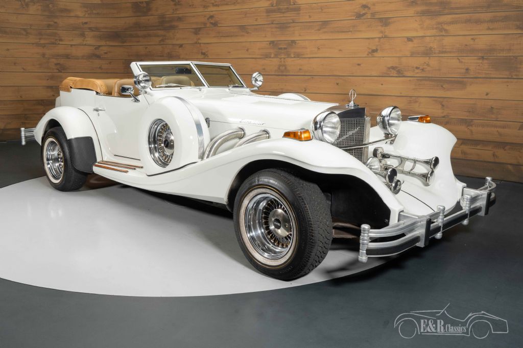 White Excalibur Phaeton Series 4 for sale This Excalibur is not only technically impressive; The exterior is also a feast for the eyes. The paintwork in timeless white combines perfectly with the chrome details, double air horns and characteristic mounting of the spare wheels. The chrome spoke wheels and large grille give the car extra grandeur. The interior is finished in beautiful beige leather, with a wooden dashboard and luxurious carpets that create a warm, classic atmosphere. Open driving is possible thanks to the removable hard top, which means that this Excalibur remains a majestic appearance with both the hood closed and the roof open. The interplay between the elegant exterior and the stylish interior makes this Phaeton a unique driving experience full of character.