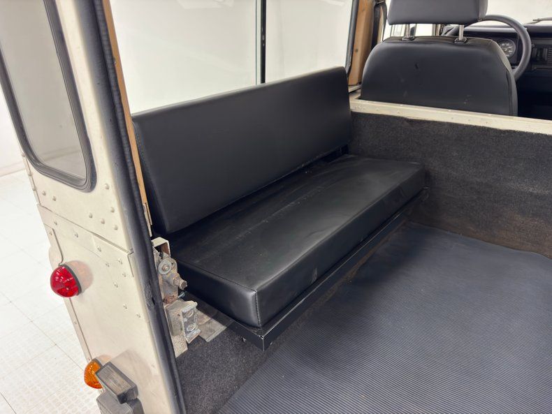 Interior Simple black plastic door panels look like they would be very comfortable with some mud, and that goes for the rear door as well. Inside, new front bucket seats in black leather sit atop the boxed risers and present cleanly with tuck and roll inserts. In back, it's a playground for kids and kids at heart with center facing bench seats that are also new. A textured black steering wheel leads to a simple instrument cluster where just four gauges live beside a large panel of indicator lights. There's a touch of patina on the dash including the center where an oil pressure gauge is located, and we note a crack in the plastic pad on the left top corner. A utilitarian shifter rises from the center console with a rubber boot in a hard plastic case. Some under dash trim is peeling and as you would imagine, the floor is rubberized front and back over gray carpet, to trap sand, mud, and snow.