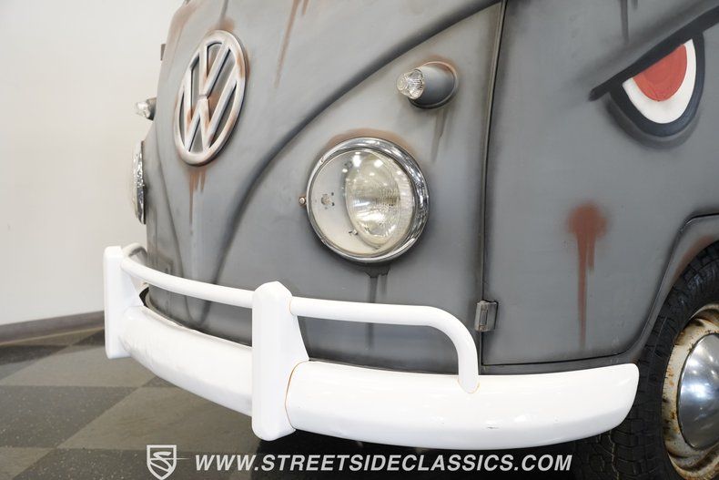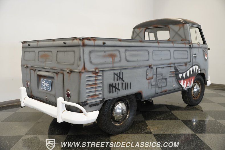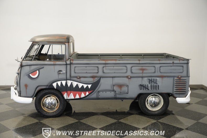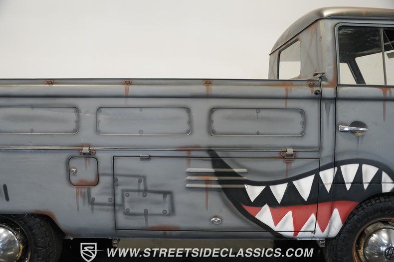 Adorned with WWII fighter plane-inspired shark graphics, the 1959 Volkswagen Single Cab Pickup Type 2 makes an immediate visual impression. Gray paint provides the perfect canvas for the custom shark artwork, giving this German commercial vehicle a unique personality all its own. The bed offers practical cargo space, while the sturdy 15" steel wheels with VW center caps provide the foundation for the 215/75R15 Toyo Open Country AT tires. Every angle of this classic hauler displays the simple, functional design that made these VW trucks such workhorses.