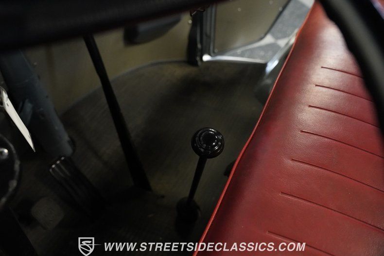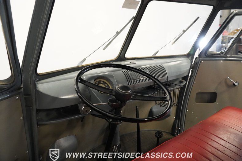 Simplicity and function define the interior of this Volkswagen truck. The red vinyl bench seat provides comfortable seating for driver and passenger alike. The gray painted dash houses straightforward gauges and controls within easy reach. Rubber floor coverings throughout the cabin offer durability and easy maintenance. The minimalist approach to the interior reflects the vehicle's utilitarian purpose while providing everything needed for driving without unnecessary frills or complications.