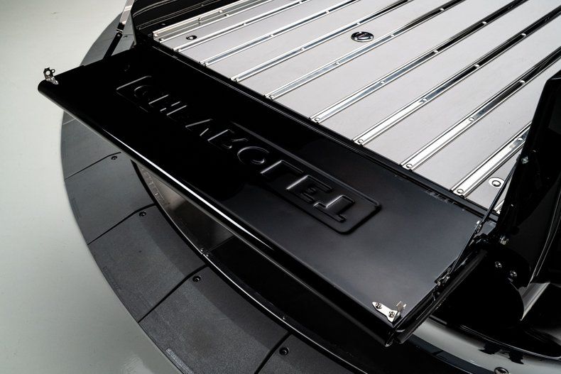 The classic body lines remain clean and purposeful, with traditional factory-style trim and no over-the-top exterior modifications. The black paint has a mirror-like depth that emphasizes the 5-window cab's iconic silhouette. Subtle custom touches include the removal of the factory taillights in favor of integrated LED units hidden in the bed rail ends, delivering a streamlined appearance. Up front, an aftermarket antenna adds functionality, while rear view mirrors mounted on both sides give the driver some added visibility. A lowered stance sits perfectly over chrome 20-inch Resto Laguna wheels that add contemporary presence. One thing that stands out on this truck is its unique bed treatment. Instead of typical varnished oak or stained pine, the bed floor features grey-painted wood panels trimmed in stainless steel for a sharp, unexpected contrast that draws attention without looking overdone or tacky.