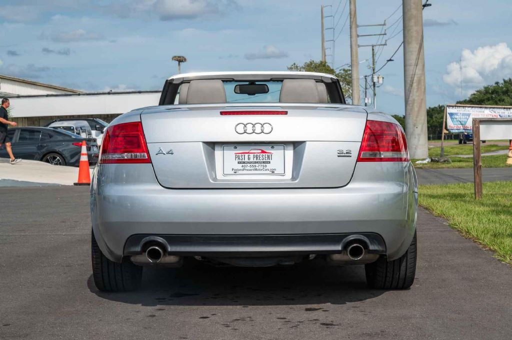 2007 Audi A4 Cabriolet Quattro 3.2 This 2007 Audi A4 2-Door Cabriolet is a well-kept, stylish convertible that combines luxury, performance, and everyday practicality. Finished in a sleek silver exterior with a refined Gray leather interior, this A4 presents beautifully and offers the premium feel Audi is known for. Powered by the desirable 3.2L V6 FSI DOHC engine paired with a smooth automatic transmission, this Cabriolet delivers strong performance with the confidence of Audis legendary Quattro All-Wheel Drive system, making it enjoyable to drive year-round. Key features include: Low Miles 91,876 original miles New Tires ready for the road ahead Full Power Package, power windows, locks, and doors Power Seats with Heated Front Seats for comfort Leather Upholstery premium Audi fit and finish Full-Size Spare Tire included for peace of mind Cold A/C & Excellent Heat for all-season driving This Audi has been well cared for and it shows in both its condition and drivability. The paint shines nicely, the interior is clean, and it runs and drives as a proper Audi should. If youre looking for a luxury convertible with low miles, all-wheel-drive capability, and classic Audi styling, this A4 Cabriolet is an excellent choice. While we do our best to provide the highest quality muscle cars with an honest and reliable description and realize the importance of transparency when selling vehicles. That being said, we have not built, modified, changed or personally owned this vehicle. Whether this vehicle is consigned or owned by Past & Present Motor Cars we do not know the vehicles complete history since new. We want to be clear and try to answer any questions our customers might have prior to purchasing. Additionally, we not only welcome but we encourage 3rd party independent inspections. Please inquire prior to purchase to make sure the advertised vehicle has not already been sold. We list our vehicles on multiple websites and a vehicle can sell at any time. If a customer chooses to purchase sight unseen (many of our customers choose this option) the customer accepts the vehicle AS IS and WHERE IS and understands we cannot address concerns after purchase. For this reason, it's important all concerns are addressed prior to purchase. We make every effort to present accurate and reliable information, but use of this information is voluntary, and should only be deemed reliable after an independent review of its accuracy, completeness, and timeliness. It is the sole responsibility of the customer to verify the existence of options, accessories and the vehicle condition before time of sale. Financing is Available with low rates and Vehicle Shipping is available from our Showroom to your Garage. A Classic Car Warranty is Available for Purchase from a 3rd Party. Please speak to our Sales Associate or Company Representative for more information. Our team is working and available anytime by Phone or Text for your convenience at 407-559-7759. Thank you for your interest!