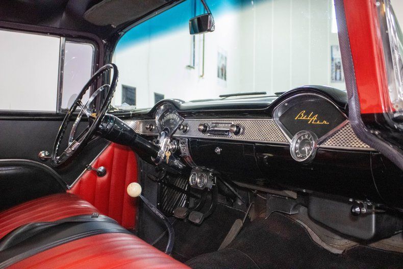This 1955 Chevrolet 210 Two-Door Sedan blends classic Tri-Five styling with tasteful custom touches and modern performance. Finished in a striking two-tone black and red paint scheme, accented by Bel Air trim and badging, the car presents with a sharp, iconic look that captures the best of 1950s Chevrolet design. The same bold theme continues inside, with a matching black and red interior that ties the whole build together and gives the cabin a clean yet nostalgic feel.