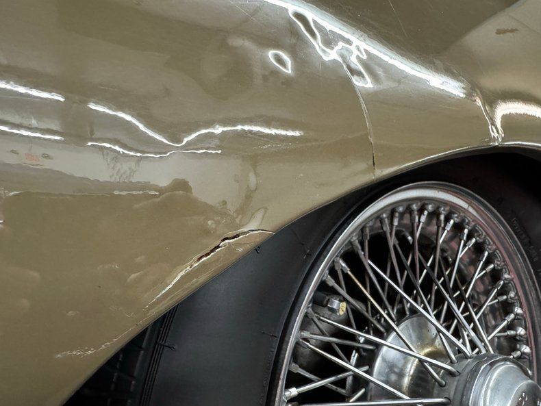 Exterior A sort of green toned brown coats the legendary lines of this big cat and is aptly named Ascot Fawn. The inset headlights and gaping mouth at the front end of the long nose, is iconic as it is epic and in nice condition with surface rust and bowing of the center emblem housing on the grille as well as on the bottom side of the crossbar. The louvers on the hood add the right amount of sportiness to the grand tourer and the 15-inch chrome wire wheels carry the class end of things, here showing some patina and peeling of the plating. The twin tailpipes extend past the rear bumper and flank the license plate and in profile, the spectacular long nose is accompanied by the high sloping rear section, long before the Porsche Panamera was dreamed up to accommodate rear passengers. Scuffs on the chin, less than perfect metal trim, uneven and cracking filler on the rear valance and numerous other places, gap imperfections, scratches, rust bubbles and some rust causing paint peeling all make our list of exterior flaws.