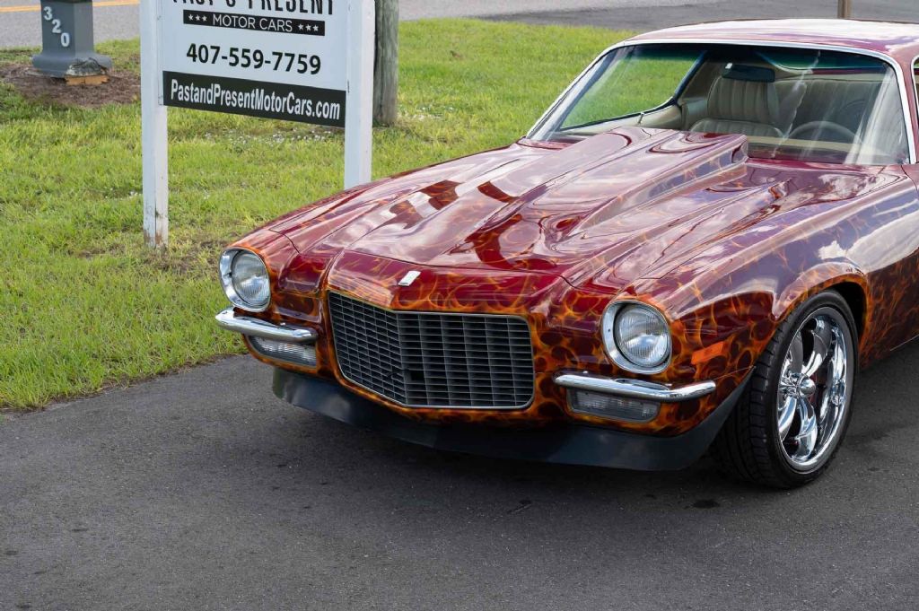 1970 Chevrolet Camaro, Rust Free, Over $100K Invested, Show Car Build This 1970 Chevrolet Camaro is a rust-free, fully restored classic that has been built to the highest standards with no expense spared. Powered by a freshly rebuilt 355 V8 engine with 9.5:1 compression, performance cam, and headers, it delivers strong power and a deep, throaty note through its great-sounding dual exhaust. The freshly rebuilt Turbo 350 automatic transmission ensures smooth and reliable shifting. The exterior is a true work of art. The previous owner collaborated directly with PPG Paint to create a custom finish with special tints that make the flames appear alive a paint job that cost nearly the price of the car itself. With over $100,000 invested in this build, the craftsmanship and attention to detail are evident everywhere you look. Inside, the custom tan interior offers both comfort and style, featuring bucket seats, a center console, and a custom steering wheel. Modern touches include an upgraded radio head unit for improved sound and convenience. Additional features include Power Disc Brakes, Air Conditioning (Currently not all components installed to function), and custom wheels that complete the cars show-ready stance. Clean, solid floors and trunk further highlight the integrity of this car. Built as a true show car, this Camaro is ready to impress on the road or the show field. From its one-of-a-kind paintwork to its high-end restoration and premium upgrades, its a must-see for any enthusiast or collector. Priced to sell fast, this is a rare opportunity to own a standout Camaro where no detail was overlooked. While we do our best to provide the highest quality muscle cars with an honest and reliable description and realize the importance of transparency when selling vehicles. That being said, we have not built, modified, changed or personally owned this vehicle. Whether this vehicle is consigned or owned by Past & Present Motor Cars we do not know the vehicles complete history since new. We want to be clear and try to answer any questions our customers might have prior to purchasing. Additionally, we not only welcome but we encourage 3rd party independent inspections. Please inquire prior to purchase to make sure the advertised vehicle has not already been sold. We list our vehicles on multiple websites and a vehicle can sell at any time. If a customer chooses to purchase sight unseen (many of our customers choose this option) the customer accepts the vehicle AS IS and WHERE IS and understands we cannot address concerns after purchase. For this reason, it's important all concerns are addressed prior to purchase. We make every effort to present accurate and reliable information, but use of this information is voluntary, and should only be deemed reliable after an independent review of its accuracy, completeness, and timeliness. It is the sole responsibility of the customer to verify the existence of options, accessories and the vehicle condition before time of sale. Financing is Available with low rates and Vehicle Shipping is available from our Showroom to your Garage. A Classic Car Warranty is Available for Purchase from a 3rd Party. Please speak to our Sales Associate or Company Representative for more information. Our team is working and available anytime by Phone or Text for your convenience at 407-559-7759. Thank you for your interest!