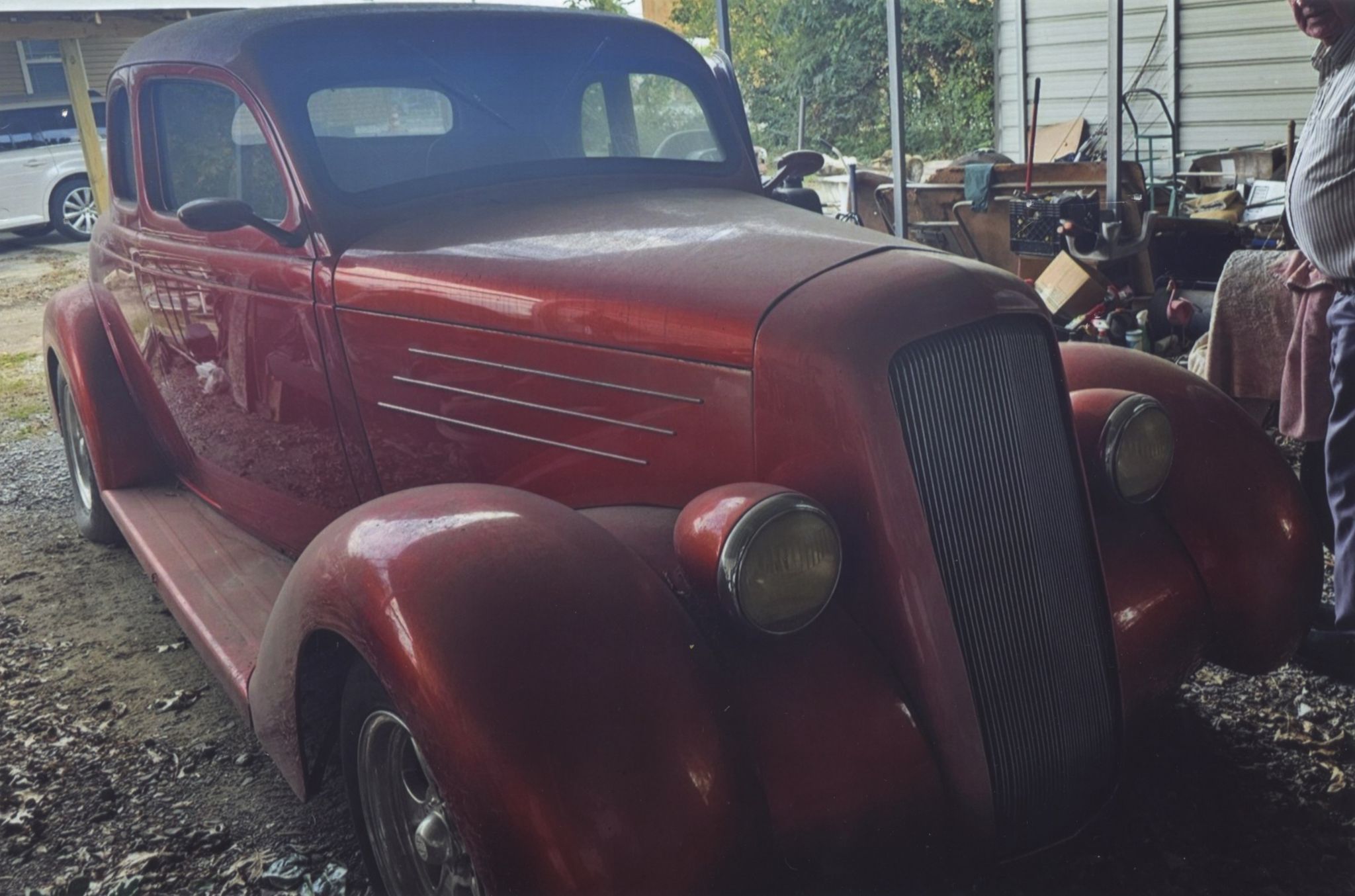All Steel customized body, smoothed doors, hood, trunk and gas cover plus smooth rear view mirrors and turn signals. Third brake and tail lights with clear coat. Three stage paint with House of Color Orion Silver over Candy Apple Red and clear coat. Custom Recessed and adjustable head lights with built in turn signals. Aluminum grill. Leather interior. Leather trunk interior and carpet floor. PW, Power trunk, PS, PB, Power hood latch. 11” disc front brakes. Hidden door release. Hidden power kill switch. Dual chrome windshield wipers. Polished pedals and heel pad. Vintage Air AC. Classic Instruments gauges. Chevy small block 400 V8, Edelbrock carb and aluminum intake. 700R4 automatic transmission with overdrive. Dayco 2800 RPM stall speed torque converter.