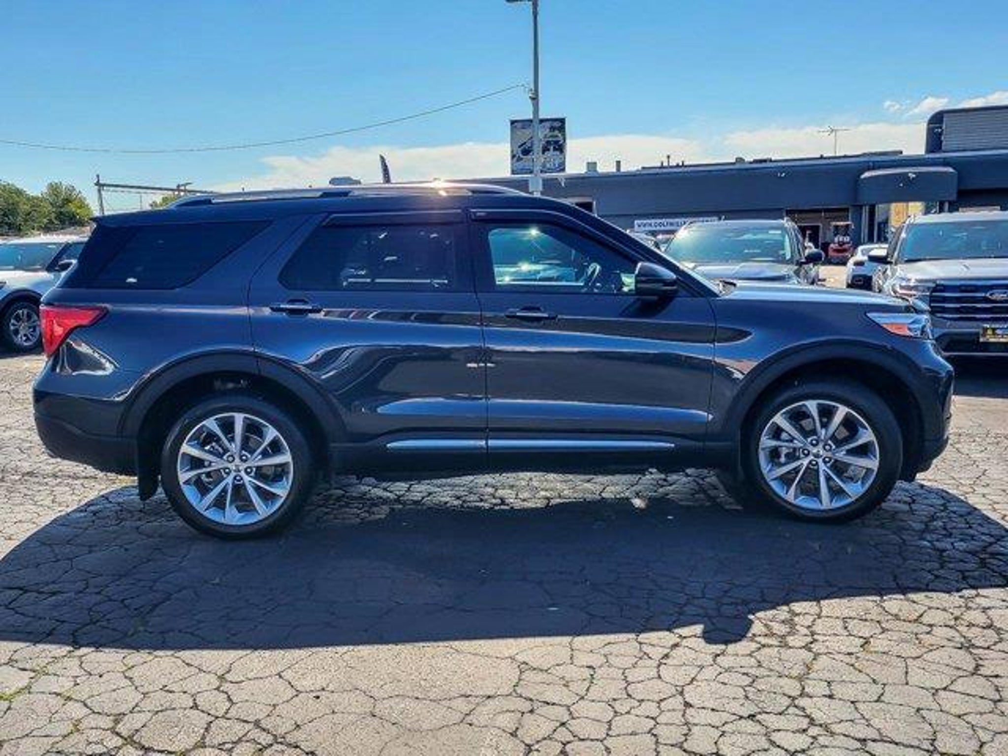 2023 Ford Explorer Platinum Stone Blue Metallic 4WD 4D Sport Utility 3.0L EcoBoost V6 10-Speed Automatic CARFAX One-Owner. Clean CARFAX. 18/24 City/Highway MPG **With some available options like Class IV Trailer Tow Package, Equipment Group 601A (3.31 Non-Limited-Slip Rear Axle Ratio), Technology Package (10.1 LCD Capacitive Portrait Touchscreen and 2 Additional Speakers), Ford Gold Certified Certified, 4WD, 12 Speakers, 3rd row seats: bench, 4-Wheel Disc Brakes, 4G LTE Wi-Fi Hotspot Credit, ABS brakes, Air Conditioning, Alloy wheels, AM/FM radio: SiriusXM, Auto High-beam Headlights, Auto-dimming door mirrors, Auto-dimming Rear-View mirror, Automatic temperature control, Brake assist, Bumpers: body-color, Cargo Mat, Compass, Delay-off headlights, Driver door bin, Driver vanity mirror, Dual front impact airbags, Dual front side impact airbags, Electronic Stability Control, Emergency communication system: SYNC 3 911 Assist, Exterior Parking Camera Rear, FordPass Connect, Four wheel independent suspension, Front & Second Row Floor Liners (16B), Front anti-roll bar, Front Bucket Seats, Front Center Armrest, Front dual zone A/C, Front fog lights, Front reading lights, Fully automatic headlights, Garage door transmitter, Genuine wood dashboard insert, Heated door mirrors, Heated front seats, Heated rear seats, Heated steering wheel, Illuminated entry, Knee airbag, Leather Htd/Ventilated Sport Captain's Chairs, Leather steering wheel, Low tire pressure warning, Memory seat, Navigation System, Occupant sensing airbag, Outside temperature display, Overhead airbag, Overhead console, Panic alarm, Passenger door bin, Passenger vanity mirror, Power door mirrors, Power driver seat, Power Liftgate, Power passenger seat, Power steering, Power windows, Radio data system, Radio: B&O Sound System by Bang & Olufsen, Rain sensing wipers, Rear air conditioning, Rear anti-roll bar, Rear reading lights, Rear window defroster, Rear window wiper, Remote keyless entry, Roof rack: rails only, Security system, Speed control, Speed-sensing steering, Speed-Sensitive Wipers, Split folding rear seat, Spoiler, Steering wheel memory, Steering wheel mounted audio controls, SYNC 3 Communications & Entertainment System, SYNC 3/Apple CarPlay/Android Auto, Tachometer, Telescoping steering wheel, Tilt steering wheel, Traction control, Trip computer, Turn signal indicator mirrors, Twin Panel Moonroof, Variably intermittent wipers, Ventilated front seats, Voice-Activated Touchscreen Navigation System, Wheel Lock Kit, and Wheels: 21 Bright Machine