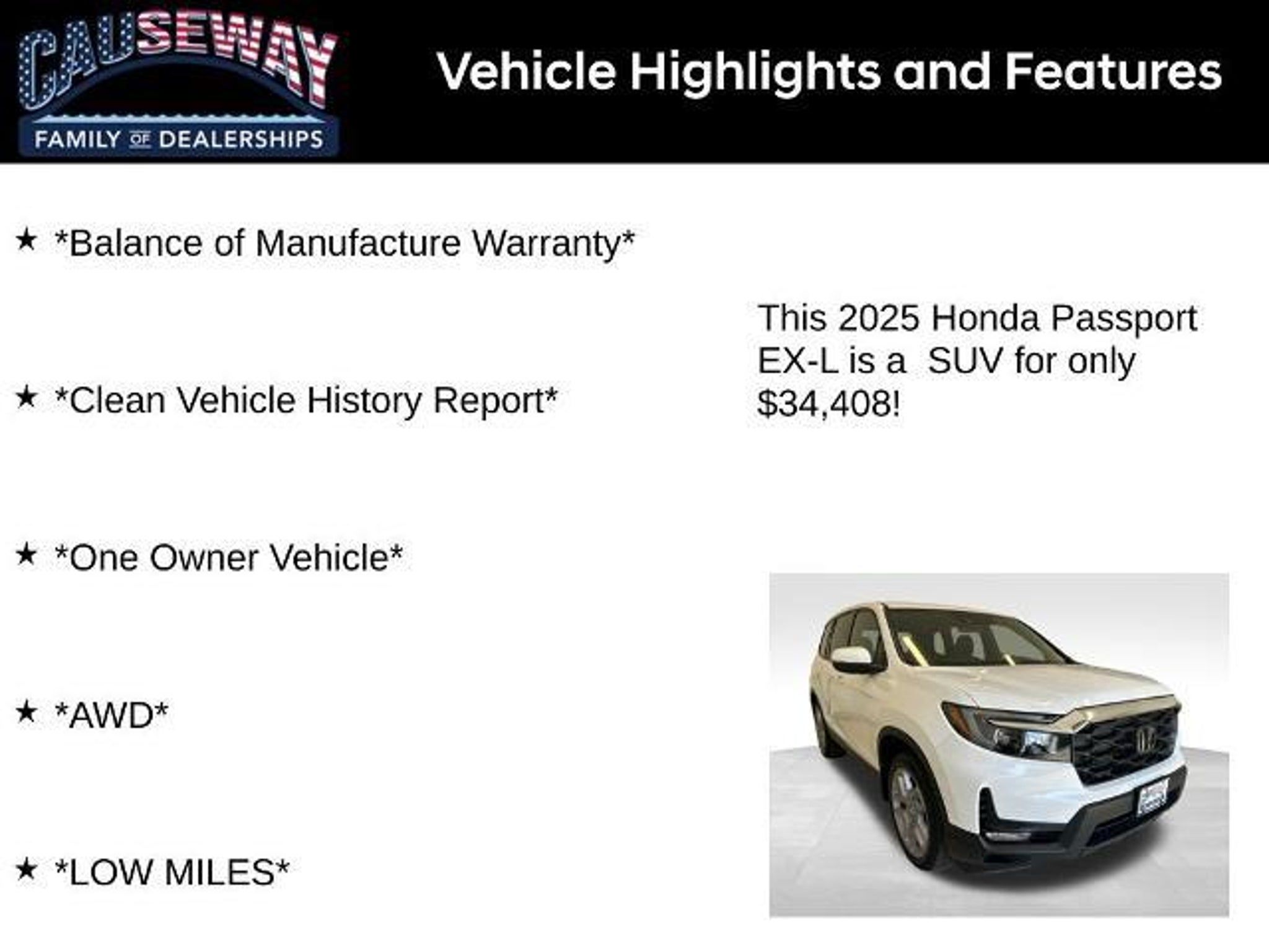 2025 Honda Passport EX-L Adventure Meets Luxury Experience the perfect combination of capability, comfort, and technology with the 2025 Honda Passport EX-L. Finished in Platinum White Pearl and boasting a leather interior, this one-owner AWD SUV offers low miles and the balance of manufacturer warranty, delivering peace of mind along with style and performance. Key Highlights Odometer: 27,836 miles well below average for a 2025 model Engine: 3.5L V6 24V SOHC i-VTEC for smooth and responsive power Transmission: 9-Speed Automatic for seamless shifting Drivetrain: AWD for confidence in all road conditions Fuel Efficiency: Competitive performance for its class Interior Comfort & Convenience Luxurious leather interior Front dual-zone automatic climate control with rear air conditioning and rear window defroster Power driver seat and steering wheel-mounted audio controls Remote keyless entry and speed control Apple CarPlay & Android Auto for seamless smartphone integration CabinControl A/V remote for added convenience Entertainment & Technology 215-Watt Audio System with 7 Speakers AM/FM Radio, SiriusXM, and Radio Data System HondaLink Assist emergency communication system for added safety Safety Features 4-Wheel Disc Brakes with ABS Dual front and side airbags, overhead airbags, and occupant sensing airbags Blind Spot Information (BSI) System for safer lane changes Front and rear anti-roll bars for improved stability Low tire pressure warning and brake assist for enhanced peace of mind Electronic Stability Control Exterior & Styling Power moonroof and Power Liftgate for convenience and style Fully automatic headlights with auto high-beam and delay-off features Heated power door mirrors with turn signal indicators Body-color bumpers and rear spoiler 20 Sparkle Silver Alloy Wheels for a bold, commanding look Rear window wiper for improved visibility With low mileage, AWD capability, and EX-L luxury features, this 2025 Honda Passport is engineered to take you on every adventure in comfort, confidence, and style. Take the next stepschedule your test drive today and experience the ultimate in Honda capability and refinement!