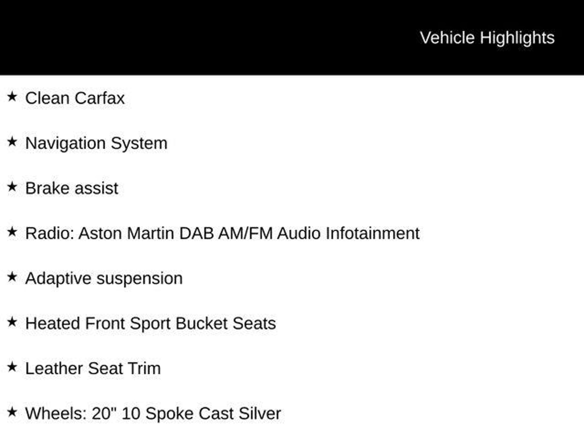 Elevate your driving experience with this stunning 2023 Aston Martin Vantage Base. Crafted with unparalleled precision and performance, this exceptional vehicle is a true testament to the brand's commitment to excellence. â Clean Carfax â F1 Edition â Navigation System â Radio: Aston Martin DAB AM/FM Audio Infotainment â Automatic temperature control â Adaptive suspension â Auto-leveling suspension â Brake assist â Fully automatic headlights â Heated Front Sport Bucket Seats â Leather Seat Trim â Wheels: 20 10 Spoke Cast Silver Powered by a thrilling V8 engine and paired with an 8-Speed Automatic transmission, this Vantage delivers a driving experience that is both exhilarating and refined. With a sleek, Black exterior and a meticulously crafted interior, this vehicle is a true work of art. Elevate your commute with the Vantage's advanced features, including a state-of-the-art navigation system, premium audio, and adaptive suspension. Enjoy the convenience of automatic climate control and the comfort of heated front seats, ensuring you and your passengers arrive in style and comfort. The Vantage's exceptional handling and performance are further enhanced by its sport-tuned suspension and precise, responsive steering. Whether you're navigating winding roads or cruising the highway, this vehicle will captivate you with its dynamic capabilities. Designed with both form and function in mind, the Vantage's sleek and aerodynamic exterior not only turns heads but also contributes to its impressive fuel efficiency, delivering an EPA-estimated 18 MPG in the city and 24 MPG on the highway. Owning this 2023 Aston Martin Vantage Base is more than just a purchase â it's an opportunity to experience the pinnacle of automotive engineering and design. Treat yourself to the thrill of driving this exceptional vehicle and discover the true meaning of power and elegance. We invite you to visit our showroom and experience the Vantage for yourself. Our knowledgeable team is here to answer any questions you may have and ensure you find the perfect vehicle to suit your driving needs. Don't miss your chance to own this remarkable Aston Martin Vantage. Schedule a test drive today and let the journey begin.
