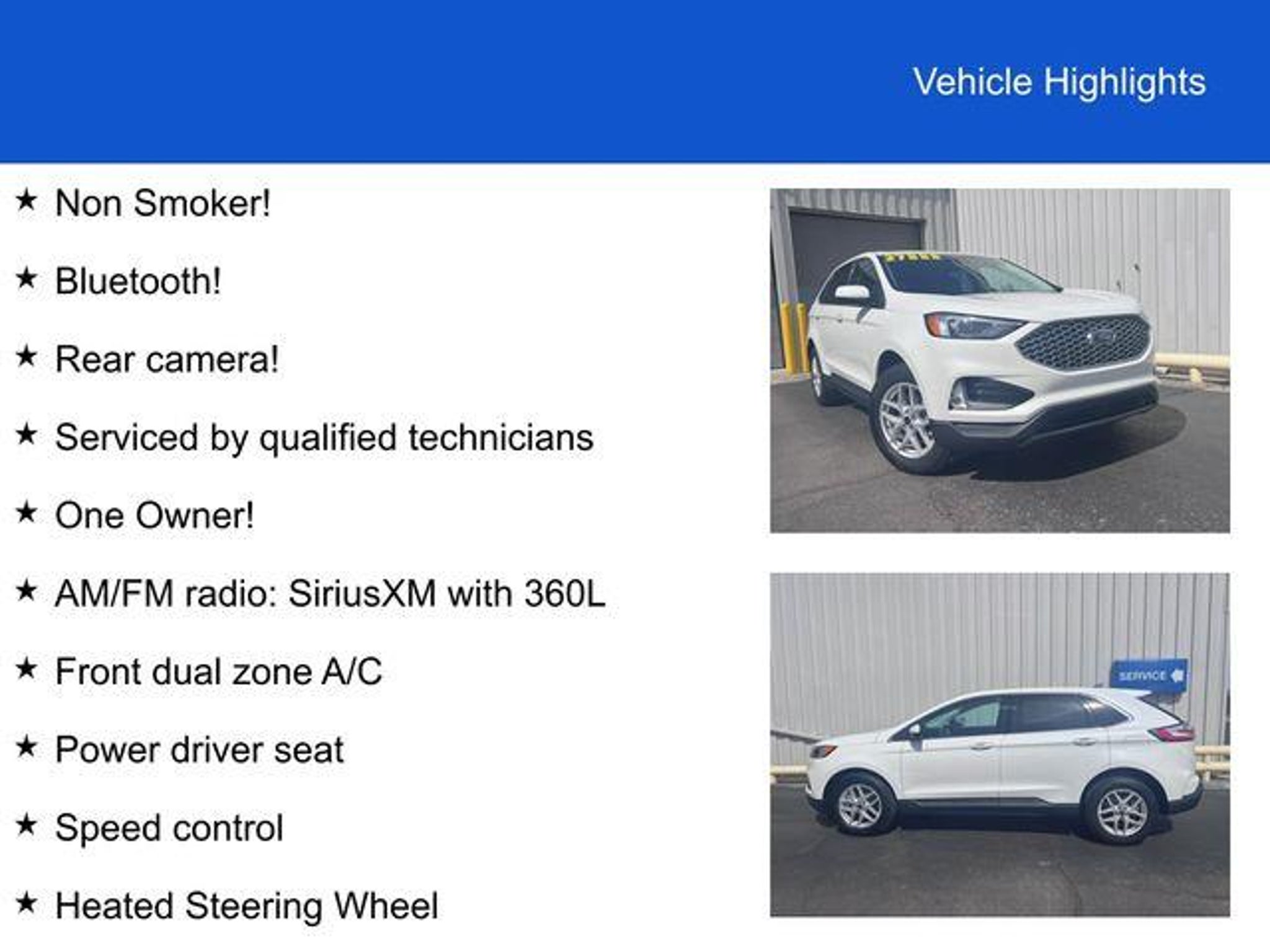Star White Metallic Tri-Coat 2023 Ford Edge SEL AWD 8-Speed Automatic EcoBoost 2.0L I4 GTDi DOHC Turbocharged VCT Non Smoker! Bluetooth! Rear camera! Serviced by qualified technicians, One Owner! AM/FM radio: SiriusXM with 360L, Front dual zone A/C, Heated front seats, Heated Steering Wheel, Power driver seat, Speed control. Recent Arrival! Odometer is 12609 miles below market average! 21/28 City/Highway MPG Mark Moats Ford. Serving the area since 1916!!!! Call us toll free at 800-783-9363.