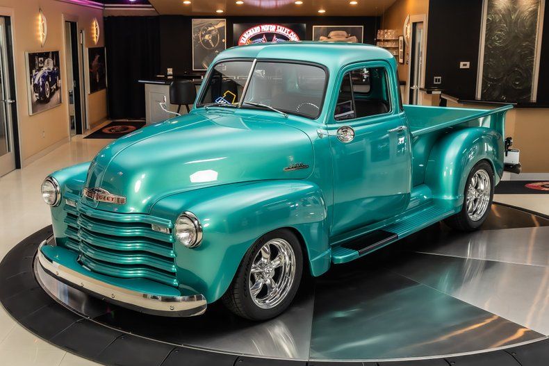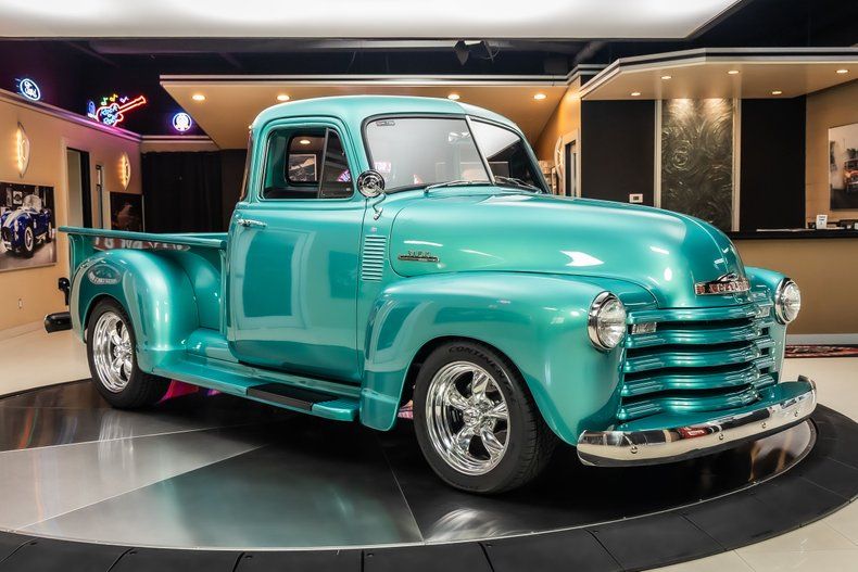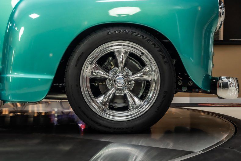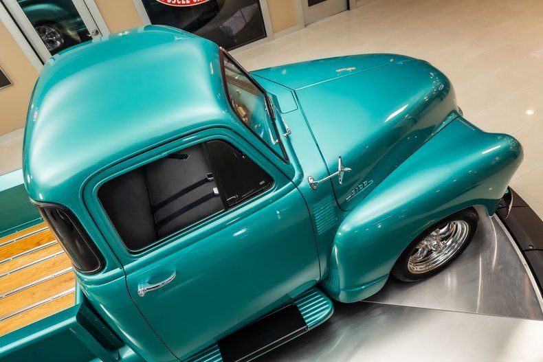 Check out this stunning 1953 Chevrolet 3100 5-Window Pickup Restomod! This 3100 has undergone a complete, frame-off restoration with no expense spared! This Truck has been finished in a beautiful Turquoise Exterior Color along with a Wood Lined Bed, Chrome Bumpers & American Racing Wheels! Under the hood sits a Chevrolet 350ci Small Block V8 Engine with a Edelbrock Four Barrel Carburetor that sits on top of the Aluminum Intake. Power is sent to the rear wheels through a TH400 3-speed Automatic Transmission and a Factory Style Rear End with a 3.00:1 Gear Ratio. Additional Features include, Power Steering, Power Brakes, Aluminum Heads and Jet Coated Headers!