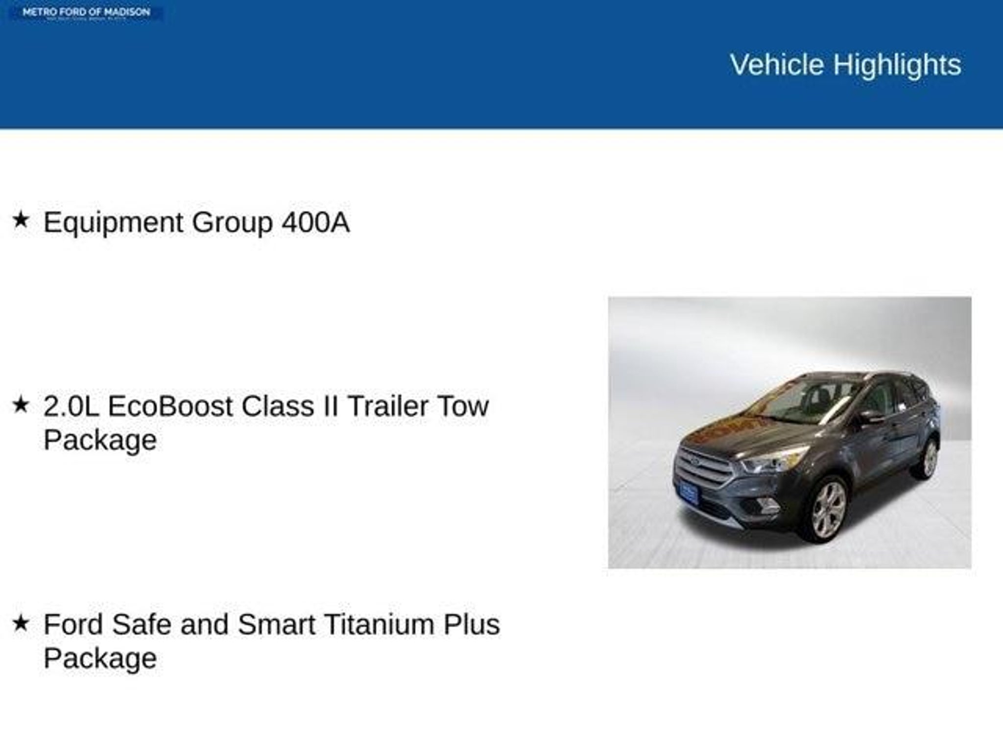 4WD, 2.0L EcoBoost Class II Trailer Tow Package, Adaptive Cruise Control & Fwd Collision Warning, Auto High-Beam Headlamps, Auxiliary Transmission Oil Cooler, Blind Spot Info System w/Cross-Traffic Alert, Equipment Group 400A, Exterior Parking Camera Rear, Ford Safe and Smart Titanium Plus Package, Lane-Keeping System, Navigation System, Panoramic Vista Roof, Power Liftgate, Rain-Sensing Wipers, Wheels: 19 Bright-Machined Aluminum. Metro Ford of Madison is proud to present this 2019 Ford Escape Titanium.4WD 6-Speed Automatic EcoBoost 2.0L I4 GTDi DOHC Turbocharged VCT21/27 City/Highway MPGStop by 5422 Wayne Terrace, Madison, WI 53718 or check us online at www.metrofordofmadison.com 608-2463600.