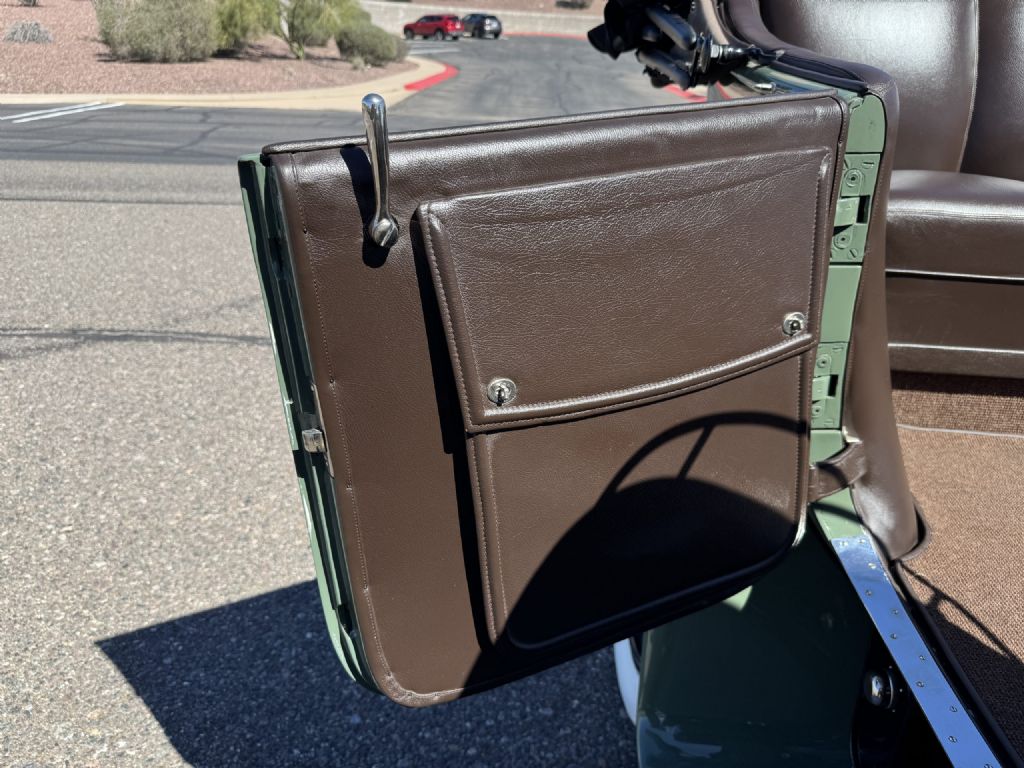 The exterior of the Pierce is striking in its original two-tone Pastel Green (PPG 42672) with brown pinstriping, presenting with a deep luster and excellent finish. The proprietary cast aluminum panel body, riveted for strength and lightness, remains dent-resistant and exceptionally well preserved. The dark brown folding convertible top is in excellent condition, accompanied by a complete set of custom-made brown fabric side curtains. Additional exterior features include patented fender-mounted headlights, ten-spoke open wheels with whitewall tires, and a leather-strap-secured rear trunk. Nickel brightwork has been fully re-plated and retains a mirror finish.
