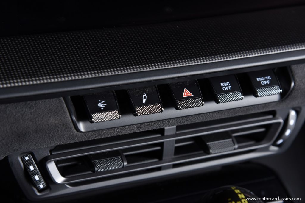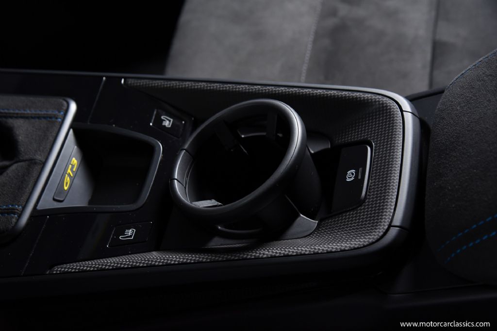 Factory options on this GT3 are extensive and tastefully configured. Highlights include the Front Axle Lift System, BOSE Surround Sound System, Sport Exhaust with black tailpipes, LED-Matrix headlights with Porsche Dynamic Light System Plus (PDLS+), Exclusive Design taillights, and 18-way Adaptive Sport Seats Plus. Visual and material upgrades abound, with a carbon fiber roof, carbon fiber mirror caps, matte carbon fiber interior trim, illuminated carbon fiber door sill guards, and Satin Black wheels featuring Shark Blue outer lips. Additional notable options include the Extended Range 23.7-gallon fuel tank, Carbon Fiber seat backs, Ambient Lighting Package, auto-dimming mirrors, heated front seats, Apple CarPlay integration, and ParkAssist rear camera.