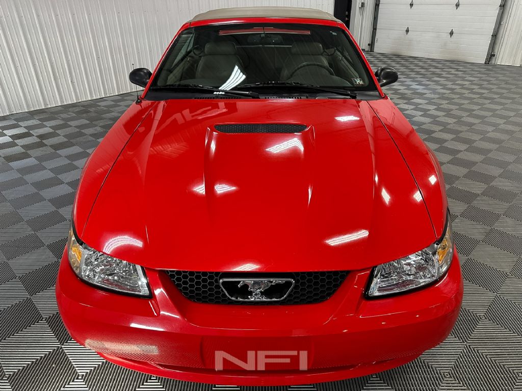 This Mustang is a stunning example of a classic American muscle car, combining performance, style, and low mileage. The car features a vibrant red exterior paired with a tan leather interior, creating a striking and attractive look. The tan soft top convertible is automatic and folds down with ease, and it comes with a black cover that snaps over the folded top for a sleek appearance.