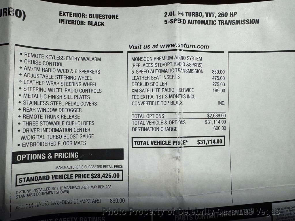 This 2007 Saturn Sky 2dr Red-Line features a 2.0L 4 CYLINDER 4cyl Gasoline engine. It is equipped with a 5 Speed Automatic transmission. The vehicle is Bluestone with a Black Leather interior. It is offered As-Is, extended warranty is available. - Leather Interior Surface - Contact Internet Sales at 702-818-1031 or info@celebritycars.com for more information. -