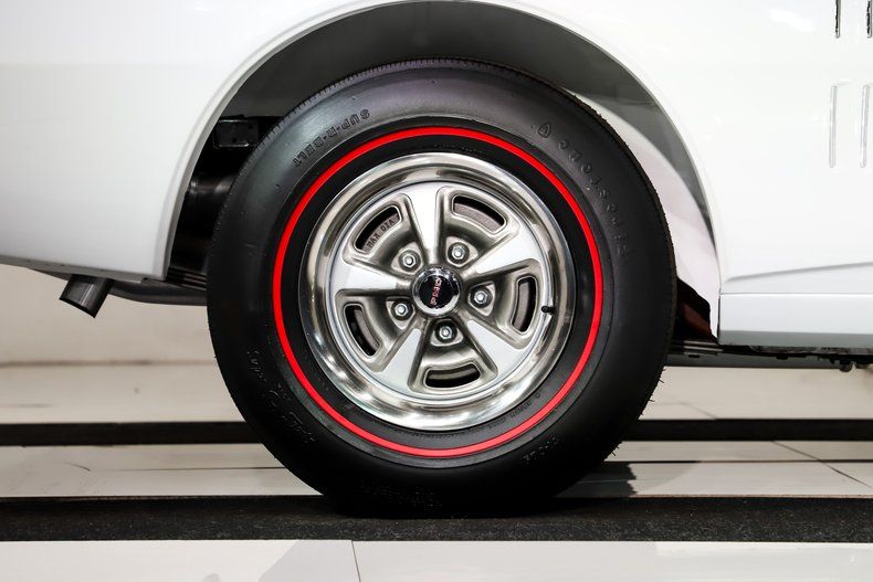 EXTERIOR: Zero rust! NOS fenders, door skins and panels professionally installed and precisely fitted. Upgraded with a functional ram air hood and a hood tachometer. Painted a bright shade of white and every square inch is polished like glass. The jambs and even the rear wheel wells are gloss white. All of the chrome and stainless trim was restored to show quality by Finishing Touch. It has the correct antenna and a remote mirror. New emblems and the ram air emblems were custom made and are copied after the original ram air prototype emblems. New date coded windshield and weatherstrips. The power convertible frame was painted and a new black top was installed. It has reproduction T-3 headlights and reproduction Firestone redline tires wrapped around a new set of Rally ll wheels.