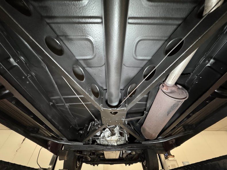 Show quality underneath with a few drips here and there and minimal surface rust. Suspension consists of leaf springs front and rear and drum brakes are also distributed to both ends. A single exhaust runs through a stock style muffler, snaking through the X-frame, then finds its way to the outside via a clean, steel pipe.