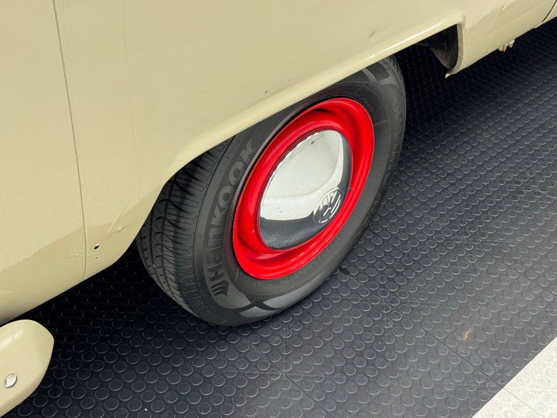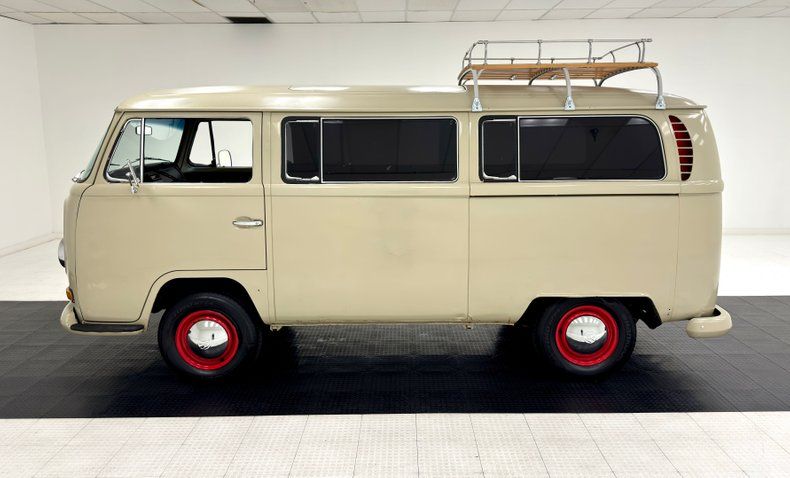 Exterior The very pleasing shade of light brown here is called Savannah Beige and is fantastically accented with red wheels, red inside the rear ducts, red inside the cowl vents, and dark tinted windows. It's a clean look that includes sharing that color with the bumpers while an Empi roof rack adds the right period touch and provides extra capacity. There's a front hook for the included tow bar and according to our consignor, an RV plug for the lights in case you want to tow this bus to your destination. Paint and metal trim are in nice shape but upon close examination, we find some imperfections including numerous drip marks and paint run, some wavy panels, uneven areas of filler, and rust bubbling on lower edges and rocker panels.