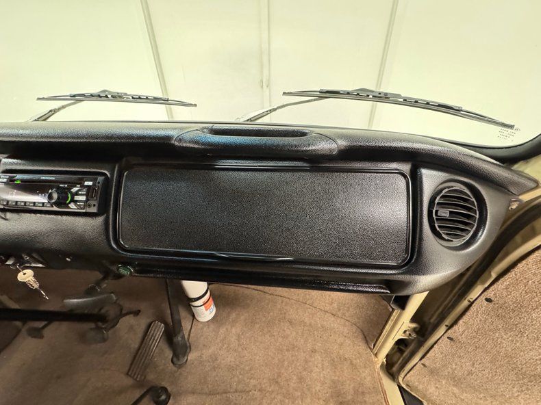 Interior Light brown tweed panels fill the inner door space and the material is also used on the floor, headliner, and footwells for a blended presentation. The front buckets seats are beige vinyl tuck and roll inserts inside of brown outer panels and a similar configuration is used on the sidewalls in back where a brown vinyl bench resides. VW didn't complicate things and the simple steering wheel leads to a black plastic dash with minimal gauges, some colorful vent levers, and a more modern Kenworth AM/FM/CD unit in the center above the floor mounted shifter. In the rear section, there is some loose fitting vinyl on the walls and a plastic shelled spare tire.