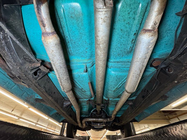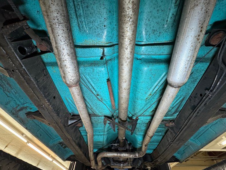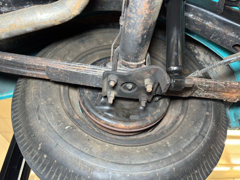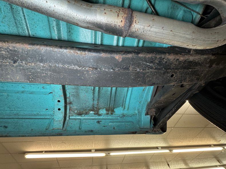 Would call this driver quality underneath with a nice blue body over the frame and components with minimal surface rust and only residual oil on the pans and some sling off the rear U-joint. Dual exhaust runs through a glasspack style muffler before exiting via chrome tips and drum brakes are supplied to all four wheels. Suspension includes coil springs up front and leaf springs out back.