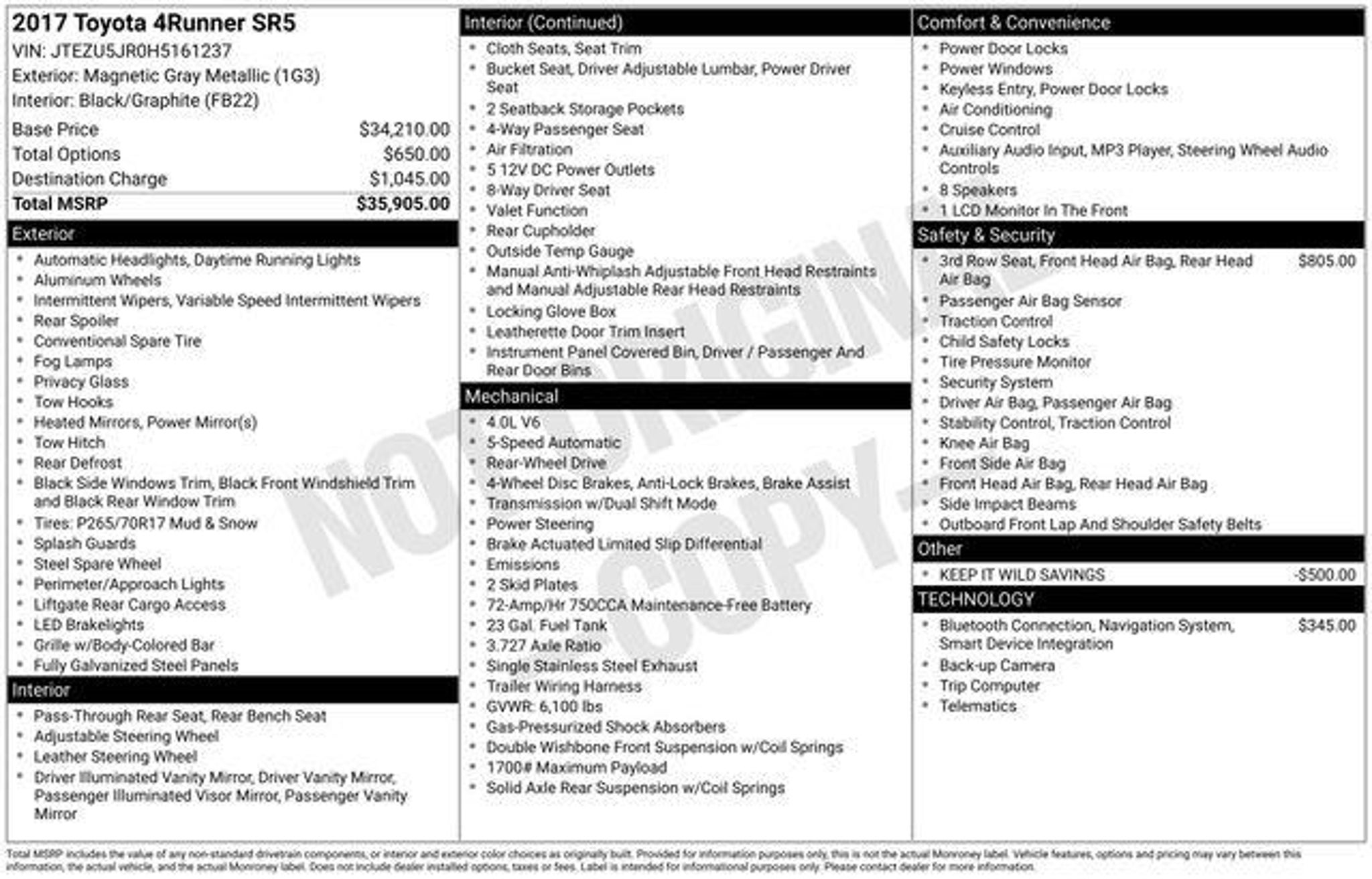Why get your next car from Robin Ford of Jeanerette? - Of course price is important and we do a great job at finding what's more than fair and reasonable! But at the end of the day we take our Internet Business Very Seriously! Shopping at Robin Ford is car buying the way it should be; Fun, Informative, and Fair! Here are our promises; *Transparent Pricing and Sales Process- NO GIMMICKS!! *Pressure Free, Efficient, Friendly, and Helpful Sales Staff! *In House Team of Loan and Lease Specialists! Good with numbers, better with people! Credit Challenged? Give us a try! *Online Credit Approval! *Online Service Scheduling - You Will LOVE the Convenience! *Certified Factory Service Technicians! This 2017 Toyota 4Runner SR5 is a rugged and capable SUV that's ready to take on any adventure. With its powerful 4.0L V6 engine, 5-speed automatic transmission, and rear-wheel drive, this 4Runner delivers an impressive blend of performance and efficiency, earning an EPA-estimated 17 mpg in the city and 21 mpg on the highway. The exterior of this 4Runner features a sleek and athletic gray paint color, complemented by a roof rack, spoiler, and 17-inch alloy wheels for a bold, adventurous look. Inside, you'll find a well-appointed cabin with premium features like leather-wrapped steering wheel, power driver's seat, and a touchscreen infotainment system with SiriusXM radio and a rearview camera. Safety is a top priority, and this 4Runner comes equipped with a suite of advanced safety technologies, including anti-lock brakes, stability and traction control, and a comprehensive airbag system. With its rugged body-on-frame construction and off-road-ready capabilities, this 4Runner is ready to handle any terrain you encounter. Whether you're looking for a capable SUV for your next family adventure or a versatile vehicle to tackle your daily commute, this 2017 Toyota 4Runner SR5 is an excellent choice. With its impressive performance, premium features, and exceptional safety, it's a smart investment that will provide years of reliable and enjoyable driving. We're confident that this 4Runner will exceed your expectations, and we invite you to come experience it for yourself at Robin Ford of Jeanerette. Our knowledgeable and friendly sales team is here to answer any questions you may have and help you find the perfect vehicle to fit your lifestyle. Don't wait - schedule a test drive today and discover the exceptional value and quality of this exceptional Toyota 4Runner.