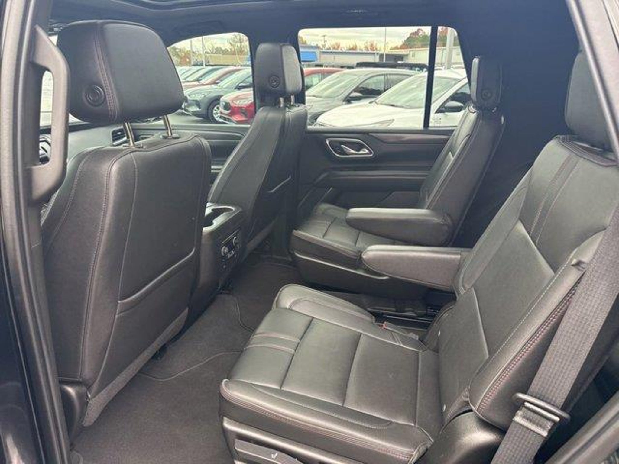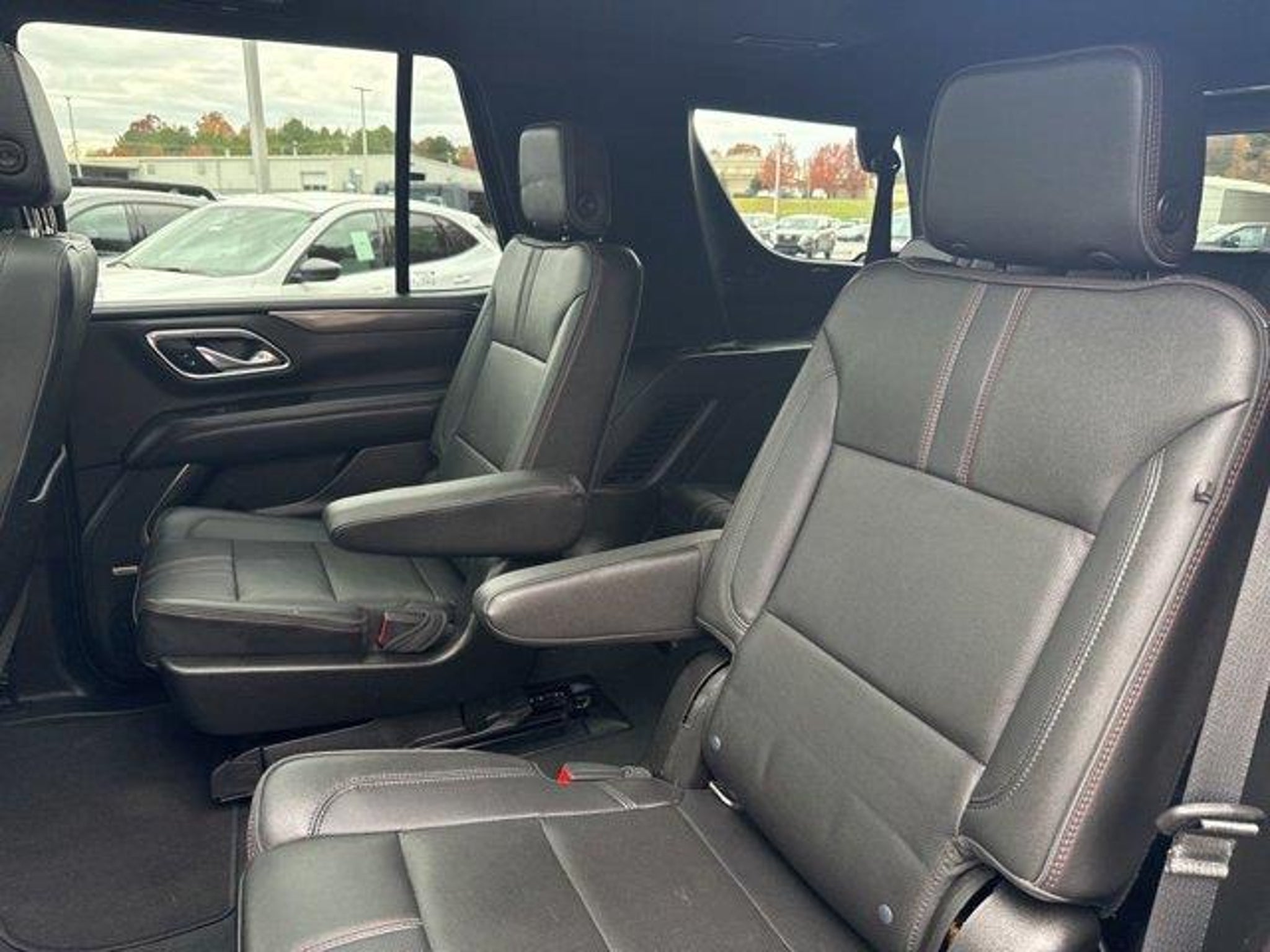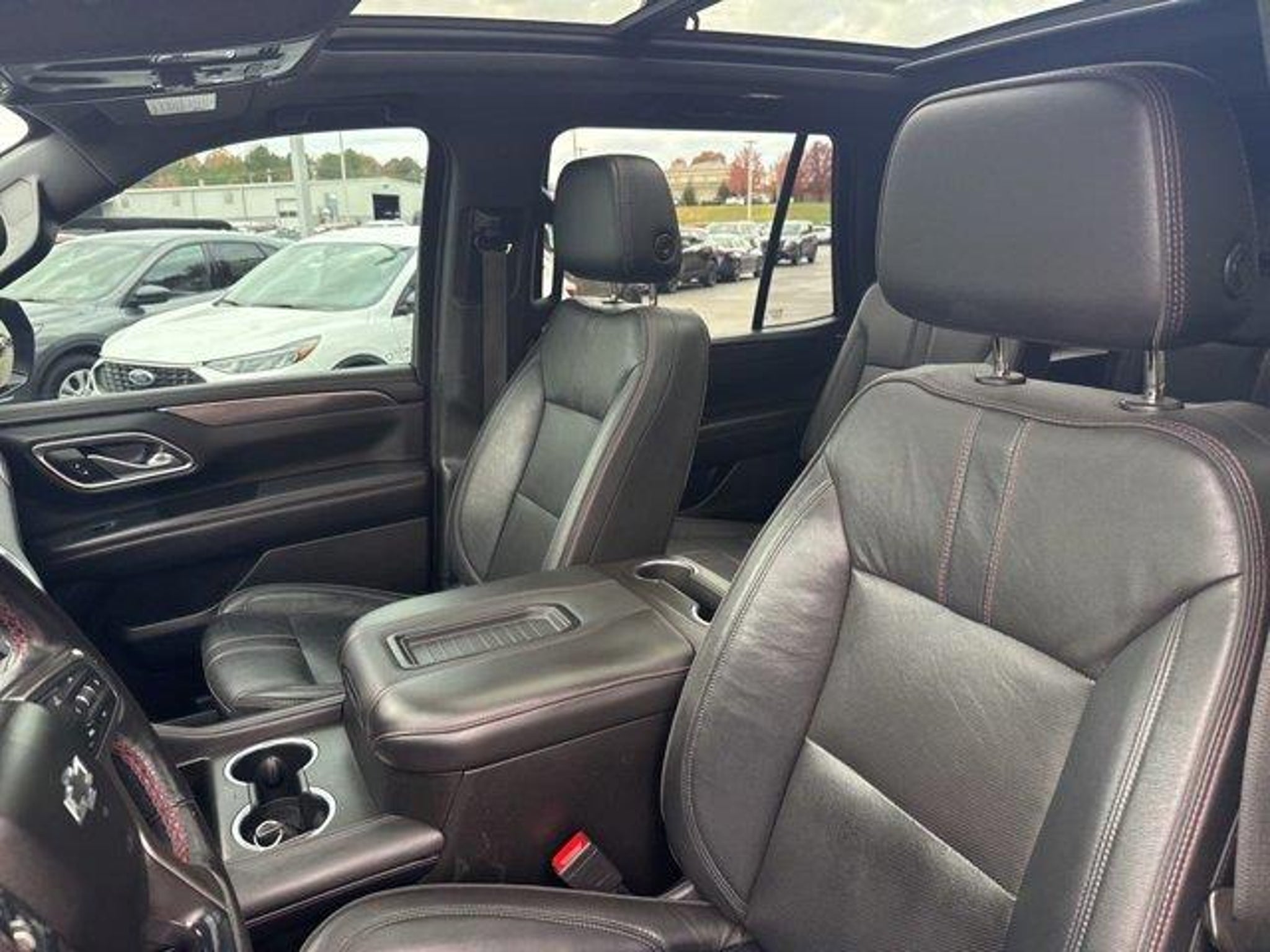 Black 2021 Chevrolet Tahoe RST 4WD 10-Speed Automatic with Overdrive EcoTec3 5.3L V8 4WD Jet Black/Victory Red Leather 10-Way Power Driver & Passenger Seat Adjusters 1st & 2nd Row Color-Keyed Carpeted Floor Mats 2 USB Data Ports 2-Speed Active Electronic AutoTrac Transfer Case 2nd Row Pwr Release 60/40 Split-Folding Bench Seat 3.23 Rear Axle Ratio 3rd Row 60/40 Power-Folding Split-Bench Seat 3rd row seats: split-bench 4-Wheel Disc Brakes 9 Speakers ABS brakes Advanced Trailering Package Advanced Trailering System Air Conditioning Alloy wheels AM/FM radio: SiriusXM with 360L Apple CarPlay/Android Auto Auto High-beam Headlights Auto-Dimming Inside Rear-View Mirror Auto-dimming Rear-View mirror Automatic Heated Steering Wheel Automatic temperature control Bose 9-Speaker Stereo Audio System Feature Brake assist Bright Front & Rear Door Sill Plates Bumpers: body-color Color-Keyed Carpeting Floor Covering Compass Delay-off headlights Driver & Front Outboard Passenger Airbags Driver Alert Package Driver door bin Driver vanity mirror Dual front impact airbags Dual front side impact airbags Dual-Pane Power Panoramic Sunroof Electronic Stability Control Emergency communication system: OnStar and Chevrolet connected services capable Extra Capacity Cooling System Floor Console w/Storage Area Four wheel independent suspension Front & Rear Park Assist Front anti-roll bar Front Bucket Seats Front Center Armrest Front dual zone A/C Front High-Back Reclining Bucket Seats Front reading lights Fully automatic headlights Garage door transmitter Hands-Free Rear Power Programmable Liftgate HD Radio HD Surround Vision Heated 2nd Row Outboard Seats Heated door mirrors Heated Driver & Front Passenger Seats Heated front seats Hitch Guidance w/Hitch View Illuminated entry Infotainment Display Integrated Trailer Brake Controller Lane Change Alert w/Side Blind Zone Alert Lane Keep Assist w/Lane Departure Warning Leather steering wheel Leather-Wrapped Steering Wheel LED Daytime Running Lamps Low tire pressure warning Luxury Package Max Trailering Package Memory seat Memory Settings Memory Settings for Driver Occupant sensing airbag Outside Heated Power-Adjustable Mirrors Outside temperature display Overhead airbag Overhead console Panic alarm Passenger door bin Passenger vanity mirror Perforated Leather Seat Trim Power door mirrors Power driver seat Power Liftgate Power passenger seat Power Release 2nd Row Bucket Seats Power steering Power Tilt & Telescopic Steering Column Power windows Preferred Equipment Group 1SP Premium audio system: Chevrolet Infotainment 3 Premium Smooth Ride Suspension Radio: Chevrolet Infotainment 3 Plus System Rain sensing wipers Rear air conditioning Rear anti-roll bar Rear Cross Traffic Alert Rear Pedestrian Alert Rear reading lights Rear seat center armrest Rear window defroster Rear window wiper Remote keyless entry Remote Start Roof rack: rails only Security system Set of 4 Wheel Locks (LPO) SiriusXM Radio w/360L Speed control Speed-sensing steering Split folding rear seat Spoiler Steering wheel mounted audio controls Tachometer Telescoping steering wheel Tilt steering wheel Traction control Trip computer Universal Home Remote Variably intermittent wipers Voltmeter Wheels: 22 Multi-Spoke Gloss Black (LPO) Wheels: 22 x 9 Steel Interim (LPO). Recent Arrival! Awards: * JD Power Automotive Performance Execution and Layout (APEAL) Study * ALG Residual Value