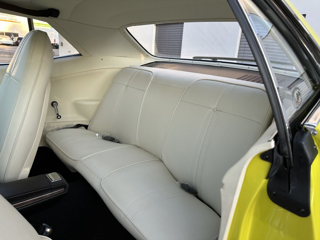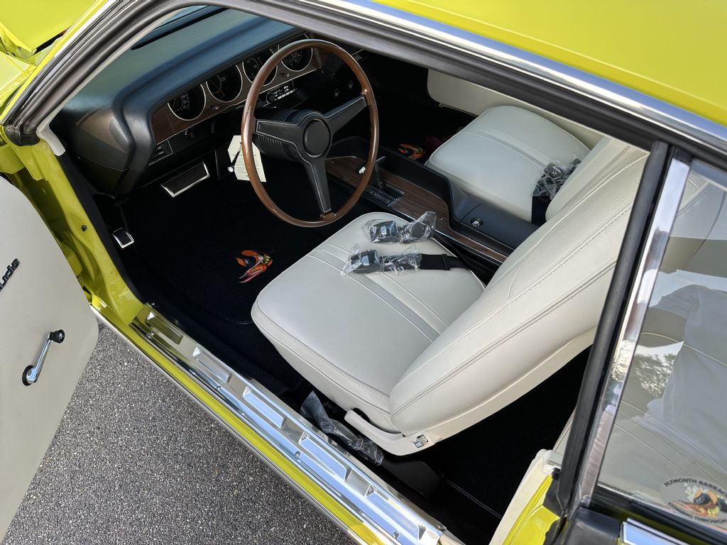 Only 129 V-Code Cudas were produced in 1971 with the A727 automatic transmission. The paint work is outstanding with the factory coded GY3 (Curious Yellow) with a factory white Interior (H6XW), factory original Shaker Hood (N96), and factory Gull Wing Spoiler (J81).