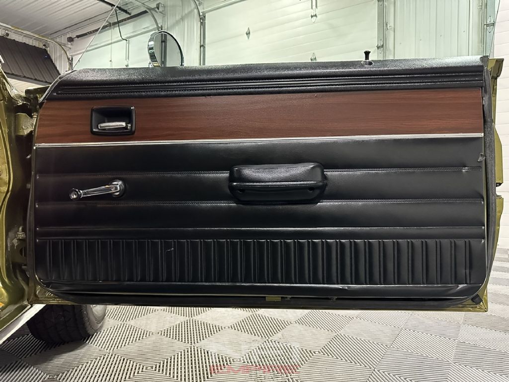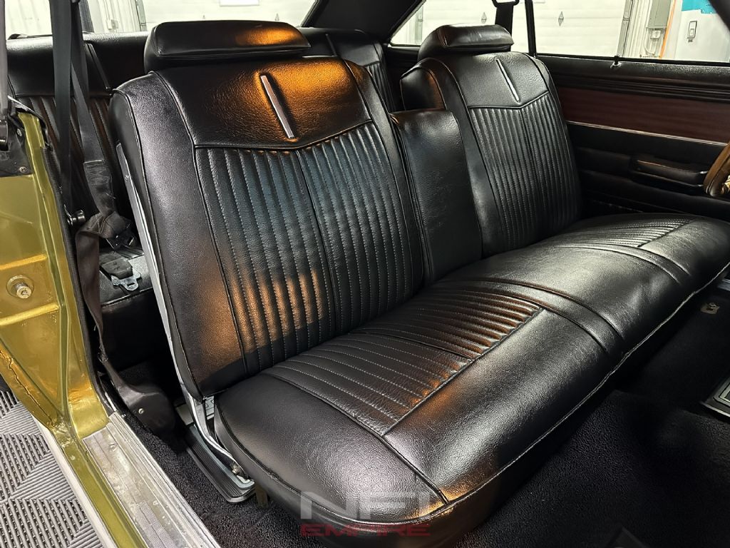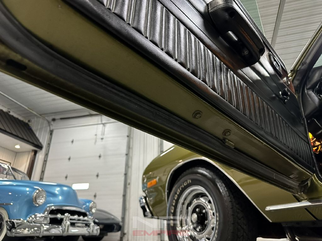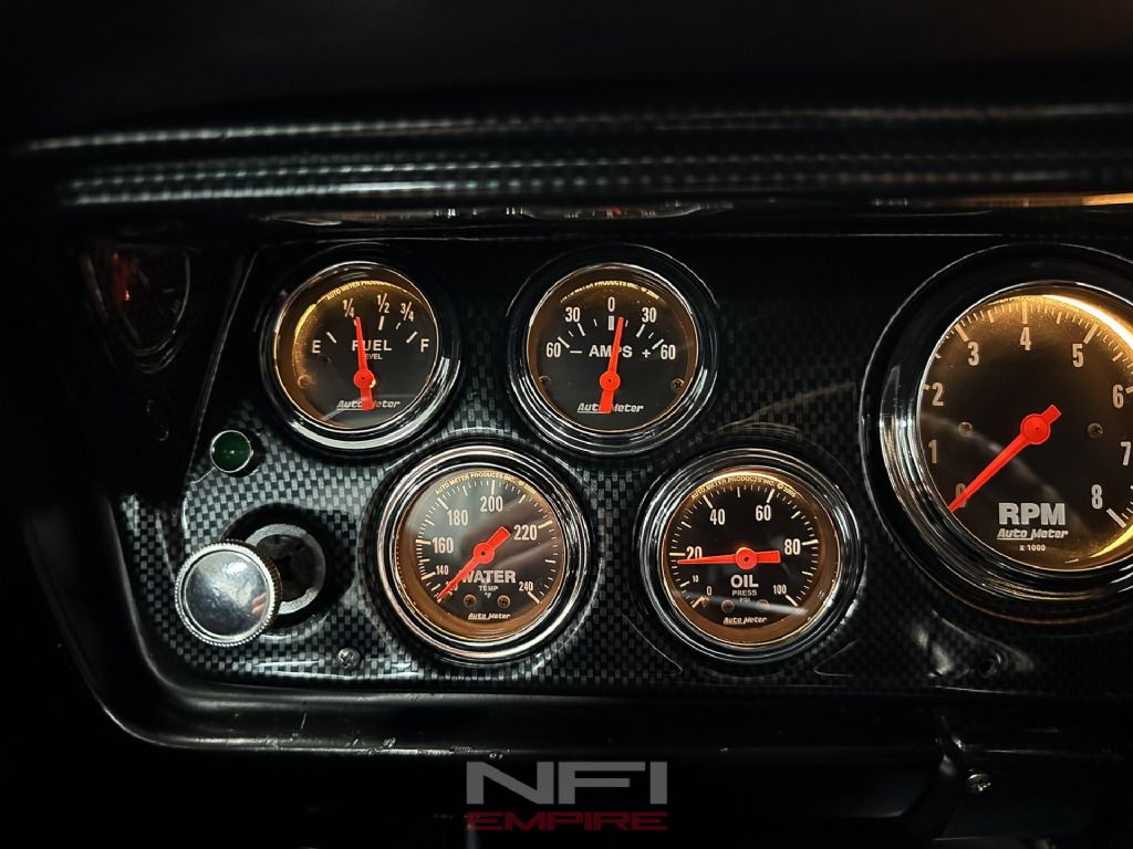 Inside, the restoration continues with Dynamat sound deadening throughout the cabin, new carpet, a new headliner, and brand-new seats. The instrument cluster has been updated with a carbon-fiber style backing and a full set of AutoMeter gauges for fuel, amps, water temperature, oil pressure, tachometer, and speedometer. A vintage-style modern AM/FM radio with a digital display provides period-correct looks with current functionality.