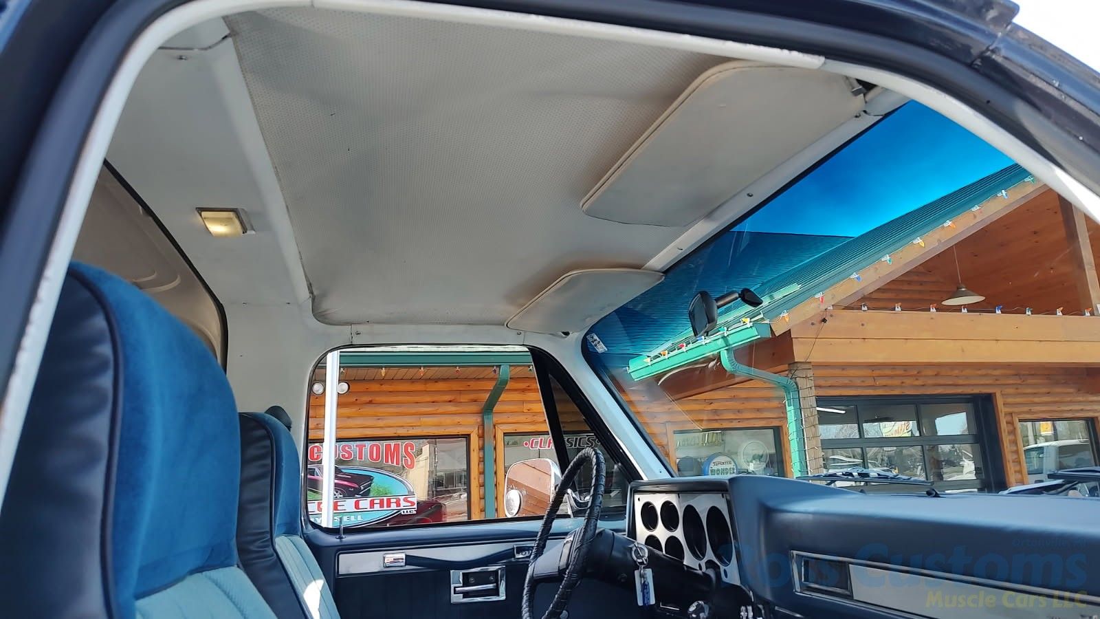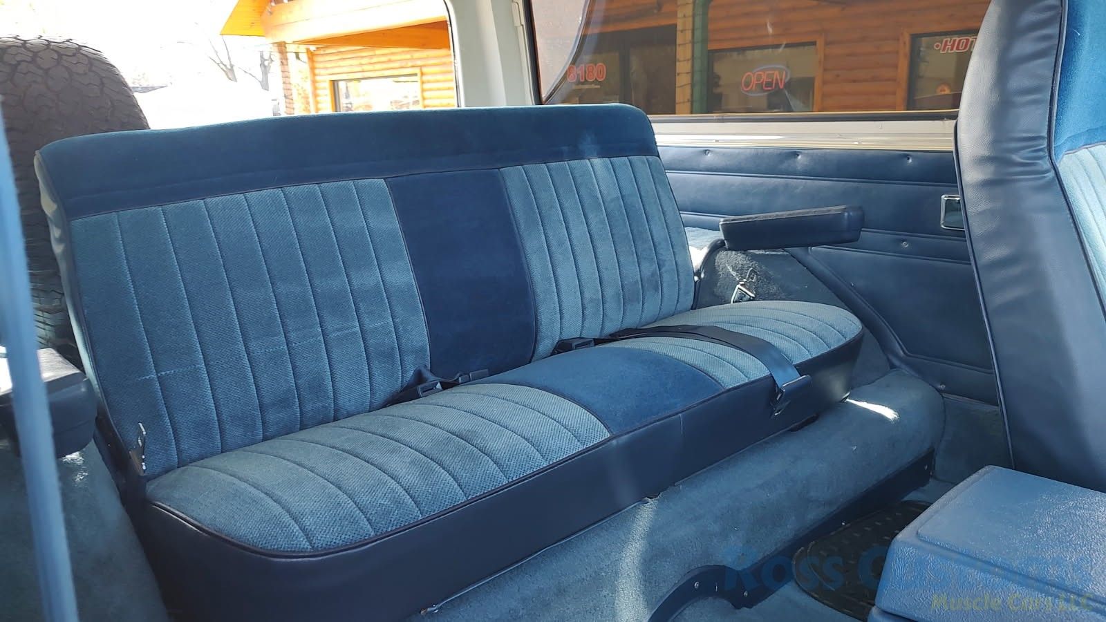 Factory Blue interior, original dash pad in excellent condition; as well as instrument cluster, gauge package - showing 45,300 miles, factory radio, AC, delay wipers, power rear tailgate window, auxiliary trailer brake control mounted under dash, original headliner and visors in very good condition, original front and rear door panels; as well as side panels, original front and rear seat in very good condition, front seat belts, original center console, appears carpet has been replaced, rare manual trans with original shifter, factory on the fly 4 wheel drive, deluxe floor mats.