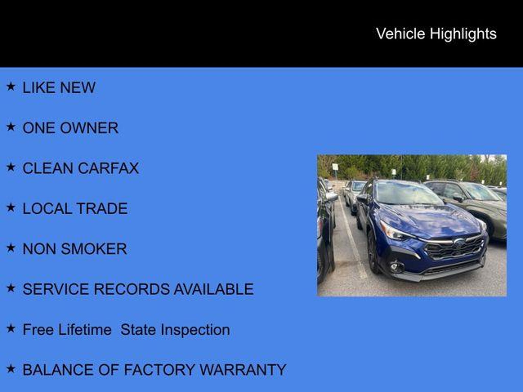 2025 Subaru Crosstrek Premium CARFAX One-Owner. Clean CARFAX. LIKE NEW, ONE OWNER, CLEAN CARFAX, LOCAL TRADE, NON SMOKER, SERVICE RECORDS AVAILABLE, Free Lifetime State Inspection, BALANCE OF FACTORY WARRANTY, 10-Way Power Driver's Seat, All-Weather Package, Blind Spot Detection (BSD), BSD/RCTA & All Wthr Pkg & Pwr Dr. Seat & Pwr Moonrf, Dual-Mode Heated Front Seats, Heated Power Exterior Mirrors, Power Moonroof, Rear Cross-Traffic Alert (RCTA) System, Windshield De-Icer Wipers. 27/33 City/Highway MPG Subaru Certified Pre-Owned Details: * SiriusXM 3-Month trial subscription, $500 Owner Loyalty coupon & 1 year trial subscription to STARLINK * Vehicle History * Warranty Deductible: $0 * Powertrain Limited Warranty: 84 Month/100,000 Mile (whichever comes first) from original in-service date * Roadside Assistance * 152 Point Inspection * Transferable Warranty Rafferty Subaru Family Owned and Operated Since 1977. We offer Customer Friendly Service Department, Nationally Recognized Stellar Care Award, Subaru Certified Sales Staff, Service Staff, and Delivery Specialist Personal and Complimentary Services which include: "¢80 vehicle loaner fleet "¢Take a FREE loaner vehicle when you service your vehicle "¢Fresh fruit, snacks, coffee, water every day "¢Local courtesy shuttle service "¢FREE Lifetime State Inspection ITS ALL ABOUT YOU AT RAFFERTY SUBARU!
