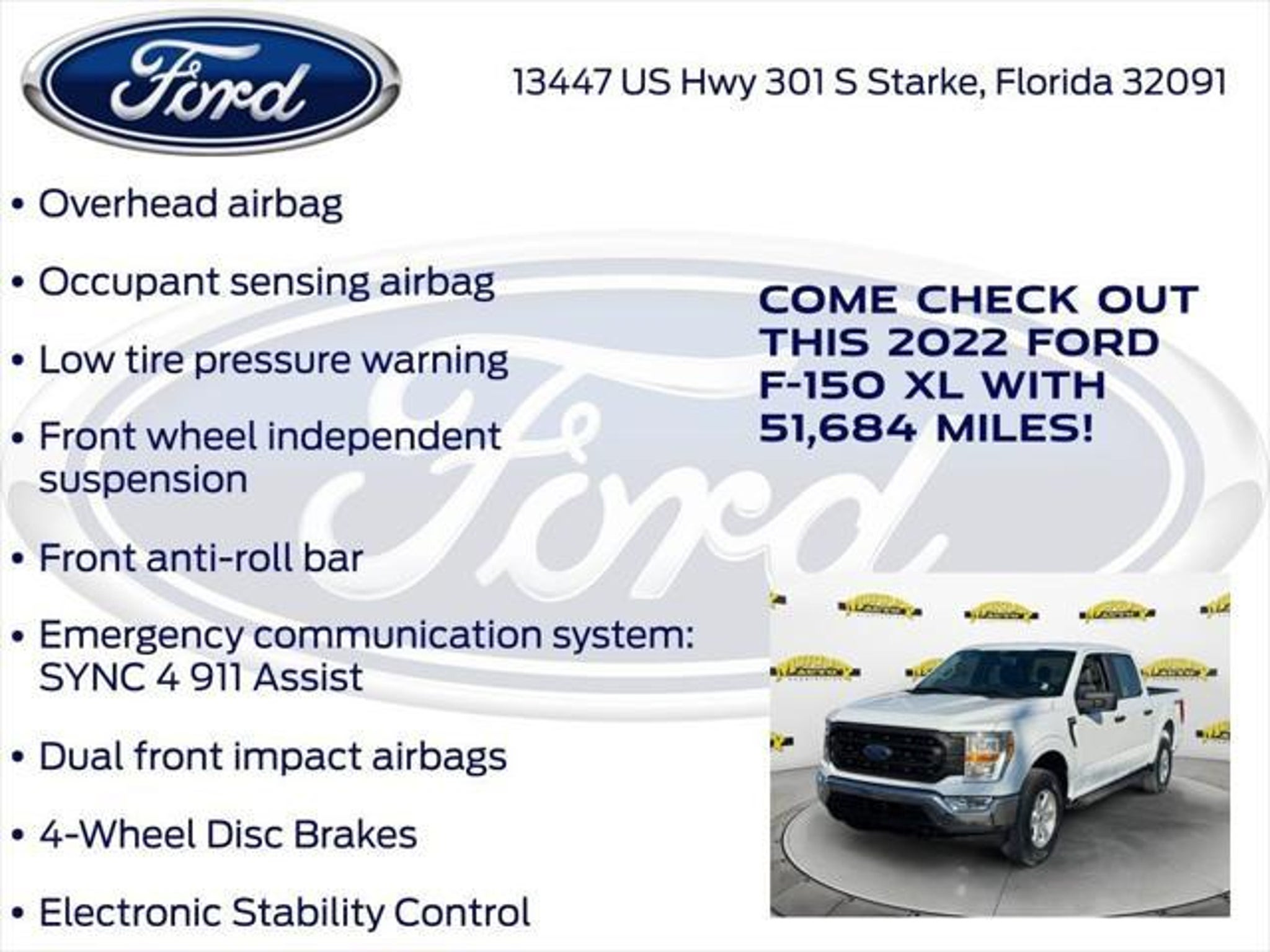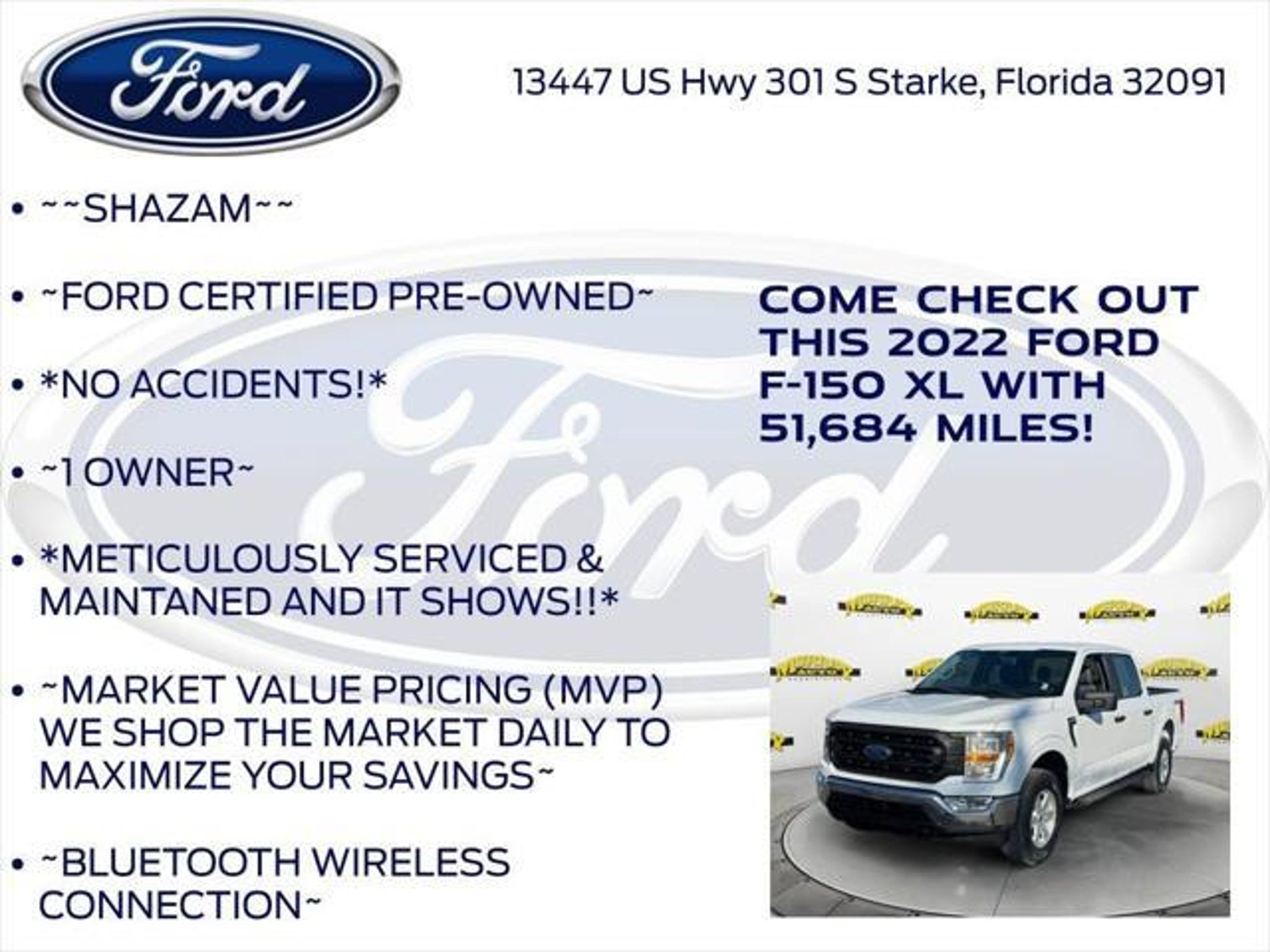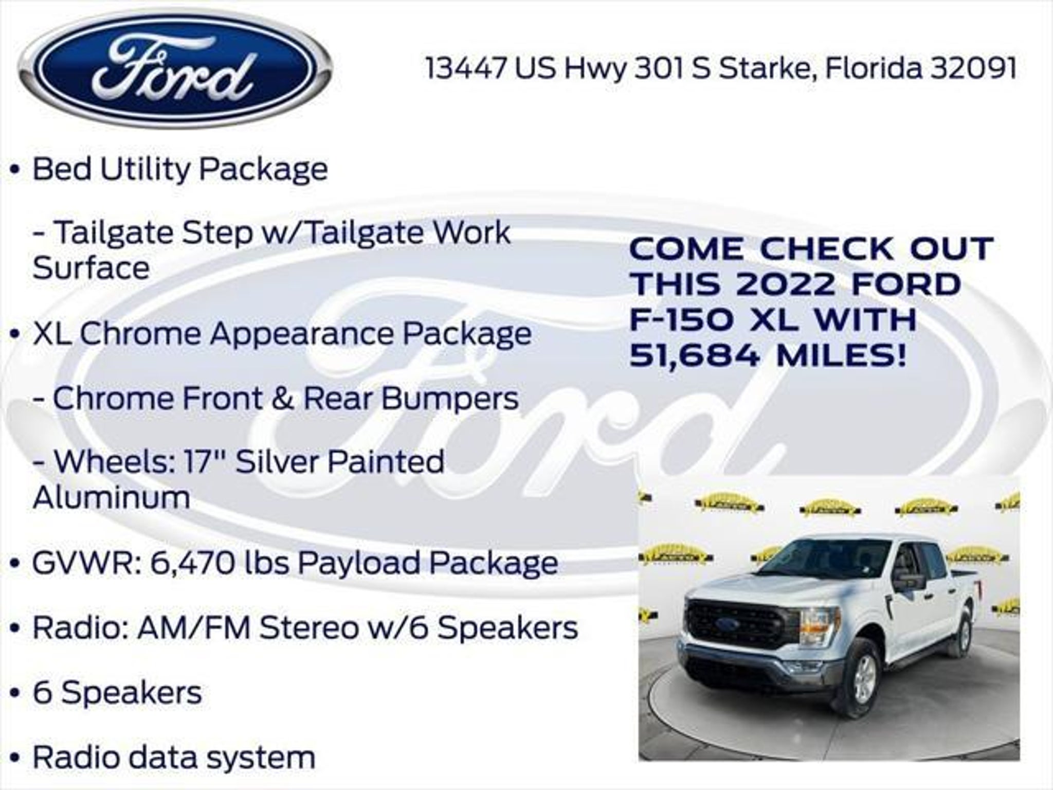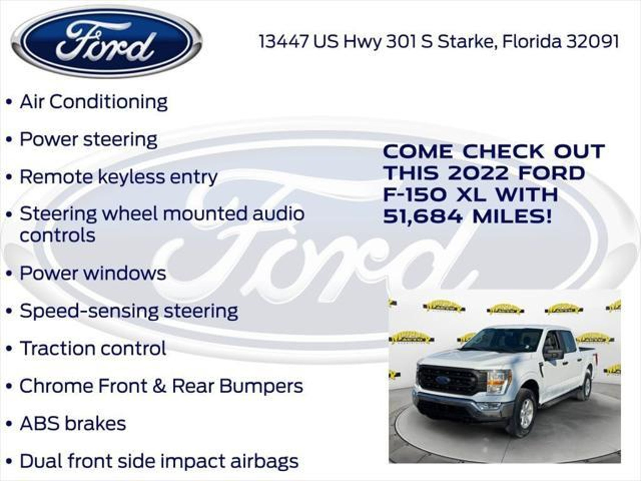 CARFAX One-Owner. Priced below KBB Fair Purchase Price! Murray Ford Superstore of Starke is very proud to offer this reliable 2022 Ford F-150 in Oxford White This vehicle is readily available and comes with the following Bed Utility Package (BoxLink and Tailgate Step w/Tailgate Work Surface), Equipment Group 101A High (Cruise Control and Reverse Sensing System), GVWR: 6,470 lbs Payload Package, Trailer Tow Package (Class IV Trailer Hitch Receiver and Integrated Trailer Brake Controller), XL Chrome Appearance Package (Chrome Front & Rear Bumpers and Wheels: 17 Silver Painted Aluminum), Ford Gold Certified Certified, 4WD, 4-Wheel Disc Brakes, 6 Speakers, ABS brakes, Air Conditioning, AM/FM radio, Auto High Beam, Auto High-beam Headlights, Auto Start-Stop Removal, Black Platform Running Boards, Brake assist, Cloth 40/20/40 Front Seat, Compass, Delay-off headlights, Driver door bin, Dual front impact airbags, Dual front side impact airbags, Electronic Locking w/3.55 Axle Ratio, Electronic Stability Control, Emergency communication system: SYNC 4 911 Assist, Extended Range 36 Gallon Fuel Tank, Exterior Parking Camera Rear, Fog Lamps, Front anti-roll bar, Front Center Armrest, Front reading lights, Front wheel independent suspension, Fully automatic headlights, Illuminated entry, Lane-Keeping System, Low tire pressure warning, Occupant sensing airbag, Outside temperature display, Overhead airbag, Overhead console, Panic alarm, Passenger door bin, Passenger vanity mirror, Power door mirrors, Power steering, Power windows, Pre-Collision Assist w/Automatic Emergency Braking, Radio data system, Radio: AM/FM Stereo w/6 Speakers, Rear step bumper, Rear-View Camera, Remote keyless entry, Security system, Speed-sensing steering, Split folding rear seat, Steering wheel mounted audio controls, SYNC 4, Tachometer, Telescoping steering wheel, Tilt steering wheel, Traction control, Trip computer, Variably intermittent wipers, Voltmeter, and Wheels: 17 Silver Steel; Ford Gold Certified Details: * 172 Point Inspection * and 22,000 FordPass Rewards Points to use toward first two maintenance visits * Roadside Assistance * Transferable Warranty * Warranty Deductible: $100 * Powertrain Limited Warranty: 84 Month/100,000 Mile (whichever comes first) from original in-service date * Limited Warranty: 12 Month/12,000 Mile (whichever comes first) after new car warranty expires or from certified purchase date * Vehicle History 15 Year 150,000 mile warranty at no cost applies to all vehicles excluding Transit Vans, DRW Trucks, any SVT Models, or similar vehicles. See sales for details! All vehicles will have a $999.00 dealer fee added to the total sale price (excludes A,Z,D, and X plan customers). Taxes, tag, and title fees will be added to all vehicles in accordance with state laws of customers registering address. *** We make every effort to provide you with the most accurate, up-to-the-minute information, however it is your responsibility to verify with the Dealer that all details listed and installed options are accurate for this specific vehicle. To ensure accuracy, please contact the dealership to verify the exact options, features and programs that are included and are available for this specific vehicle prior to purchase.