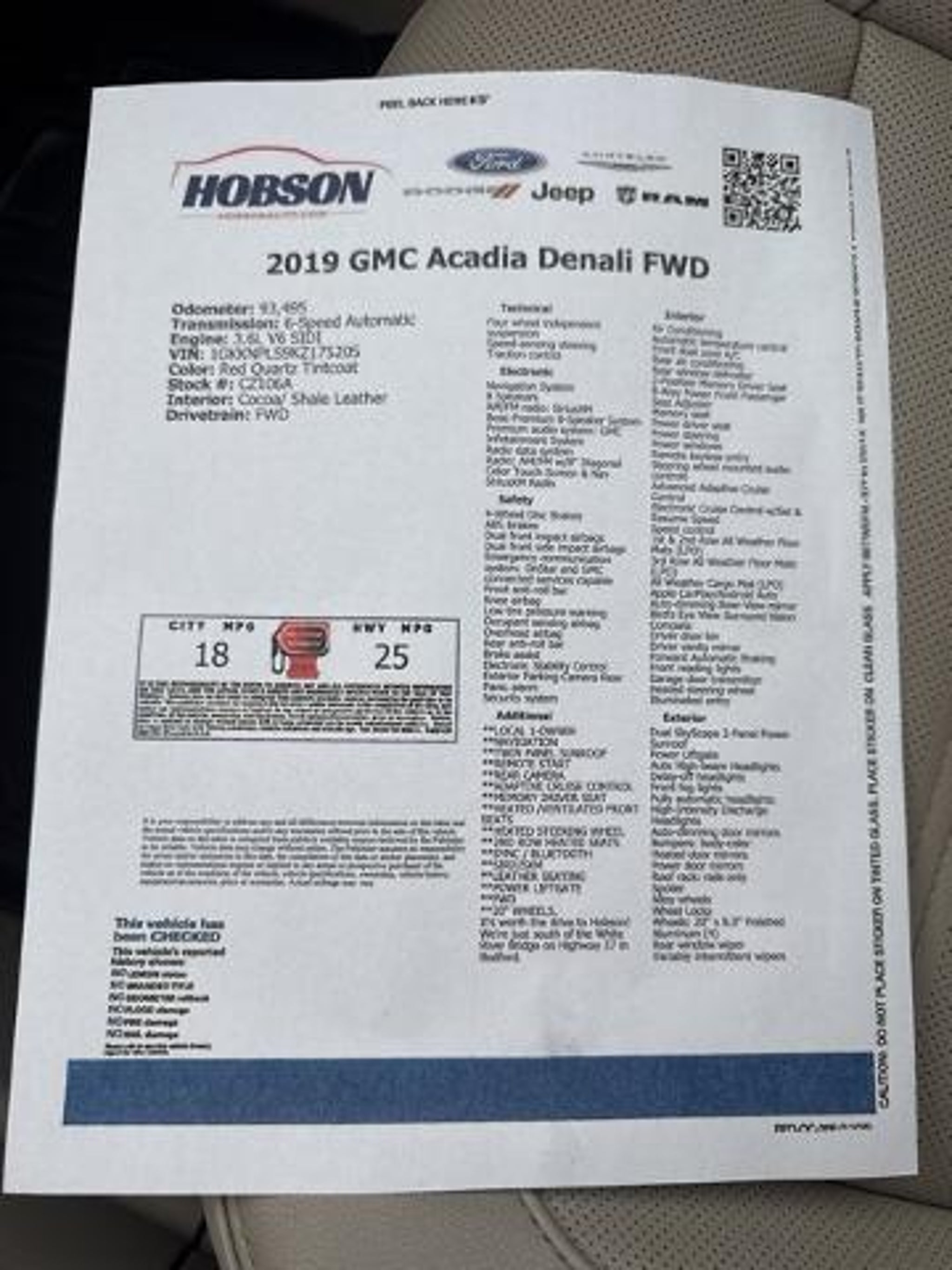 **LOCAL 1-OWNER, **NAVIGATION, **TWIN PANEL SUNROOF, **REMOTE START, **REAR CAMERA, **ADAPTIVE CRUISE CONTROL, **MEMORY DRIVER SEAT, **HEATED /VENTILATED FRONT SEATS, **HEATED STEERING WHEEL, **2ND ROW HEATED SEATS, **SYNC / BLUETOOTH, **SIRIUSXM, **COCOA/SHALE LEATHER SEATING, **POWER LIFTGATE, **FWD, **20 POLISHED ALUMINUM WHEELS. This 2019 GMC Acadia Denali FWD with the exclusive Altitude Special Edition commands attention with its sleek, dark-accented presence and bold, confident stance, blending luxury and athleticism in a way few SUVs can match. Its signature Denali refinement shines through in every detail, from the sculpted chrome grille to the premium interior crafted for comfort and sophistication, while the Altitude package adds an edge with distinctive blacked-out wheels, exterior trim, and an unmistakably modern attitude. Powered by a smooth yet assertive V6, it delivers a refined ride thats as composed on the open highway as it is impressive pulling up to any destination. This Acadia is more than a family SUV, its a statement of style, innovation, and elevated driving experience. It's worth the drive to Hobson! We're just south of the White River Bridge on Highway 37 in Bedford.