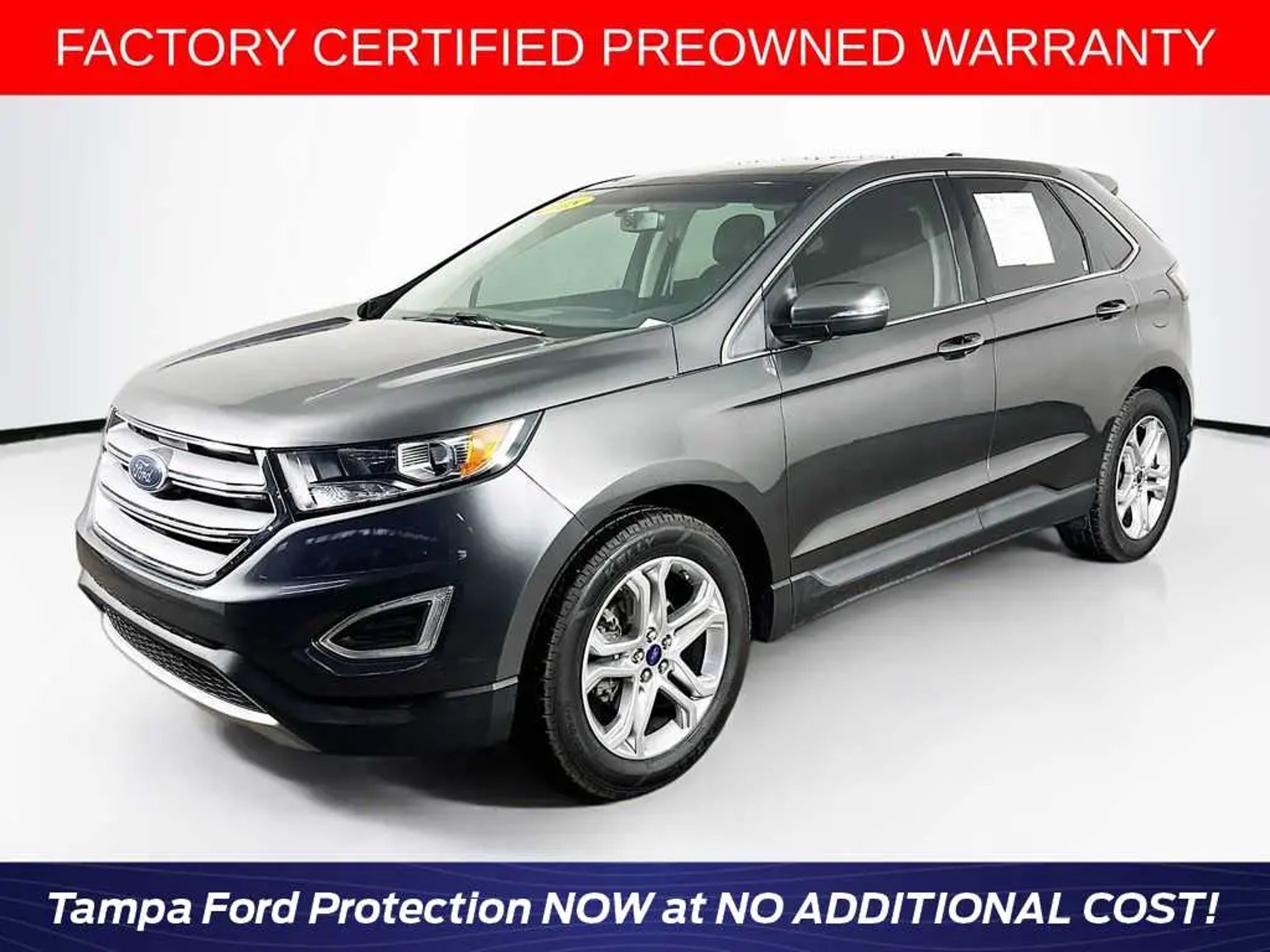 Ford Gold Certified. Heated Leather Seats, Navigation, Premium Sound System, Power Liftgate, Turbo Charged, Back-Up Camera, ENGINE: TWIN-SCROLL 2.0L ECOBOOST, COLD WEATHER PACKAGE, EQUIPMENT GROUP 301A, Alloy Wheels. KEY FEATURES INCLUDE Leather Seats, Power Liftgate, Heated Driver Seat, Back-Up Camera, Premium Sound System. Ford Titanium with Magnetic exterior and Ebony interior features a 4 Cylinder Engine with 245 HP at 5500 RPM*. OPTION PACKAGES EQUIPMENT GROUP 301A Heated Rear-Seats, 110V/150W AC Power Outlet, Panoramic Vista Roof, power open/close w/power shade and acoustic-laminate glass, Standard 2nd row LED dome light is replaced w/2 single lights, Switch located in each grab handle pocket, Voice-Activated Touchscreen Navigation System, pinch-to-zoom capability, SiriusXM Traffic & Travel Link, a, Services are not available in Alaska or Hawaii, SiriusXM audio and data services each require a subscription sold separately, or as a package, by Sirius XM Radio Inc, If you decide to continue service after your trial, the subscription plan you choose will automatically renew thereafter and you will be charged according to your chosen payment method at then-current rates, Fees and taxes apply, To cancel, COLD WEATHER PACKAGE Heated Steering Wheel, Front & Rear Floor Liners, Custom accessory, pre-installed, Windshield Wiper De-Icer, ENGINE: TWIN-SCROLL 2.0L ECOBOOST (STD). EXPERTS REPORT The Edge delivers good stopping response and performance thats above average for the class with 119 feet needed to stop from 60 mph. -Edmunds.com. PURCHASE WITH CONFIDENCE Every Gold Certified vehicle must be a Ford model less than 6 years old, Service available at any Ford Dealer in the 50 states. Each comes with manufacturer-backed 12-month/12,000-mile Comprehensive Limited Warranty coverage and, a 14-day/1,000 mile (whichever comes first) money Back Guarantee, and 24-Hour Roadside Assistance. 22,000 FordPass Rewards Points4 to use towardscheduled maintenance visits or other rewards, CARFAX® Vehicle History Report and SiriusXM® Complimentary 3 Month Trial BUY FROM AN AWARD WINNING DEALER At Elder Ford of Tampa, were eager to provide the winning Ford sales, auto service, and car financing in Tampa you seek. Were proud of our Ford dealership near St. Petersburg, FL, where a state-of-the-art facility, comprehensive new Ford showroom and fully loaded service bay await, while a savvy team of Ford professionals is prepared to meet your every need. Were not just interested in serving you right here and now, we want to be your dealership for life! Horsepower calculations based on trim engine configuration. Please confirm the accuracy of the included equipment by calling us prior to purchase.
