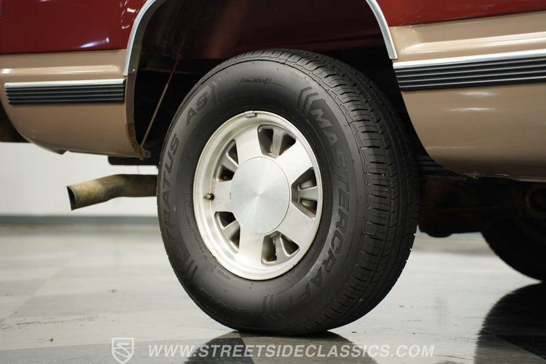Like the interior, the drivetrain is believed to be original. The engine bay hosts a 5.7-liter V8 connected to a 4L60E 4-speed automatic transmission that links to an 8.5-inch 10-bolt rear axle. The front suspension is a stock independent setup with torsion bars, and the rear is stock with leaf springs. Fifteen-inch stock wheels are wrapped in 235/75R15 tires, and behind those are front power disc brakes and rear power drum brakes. The exhaust is a stock-style dual exhaust that runs into a stock muffler and exits as a single exhaust.