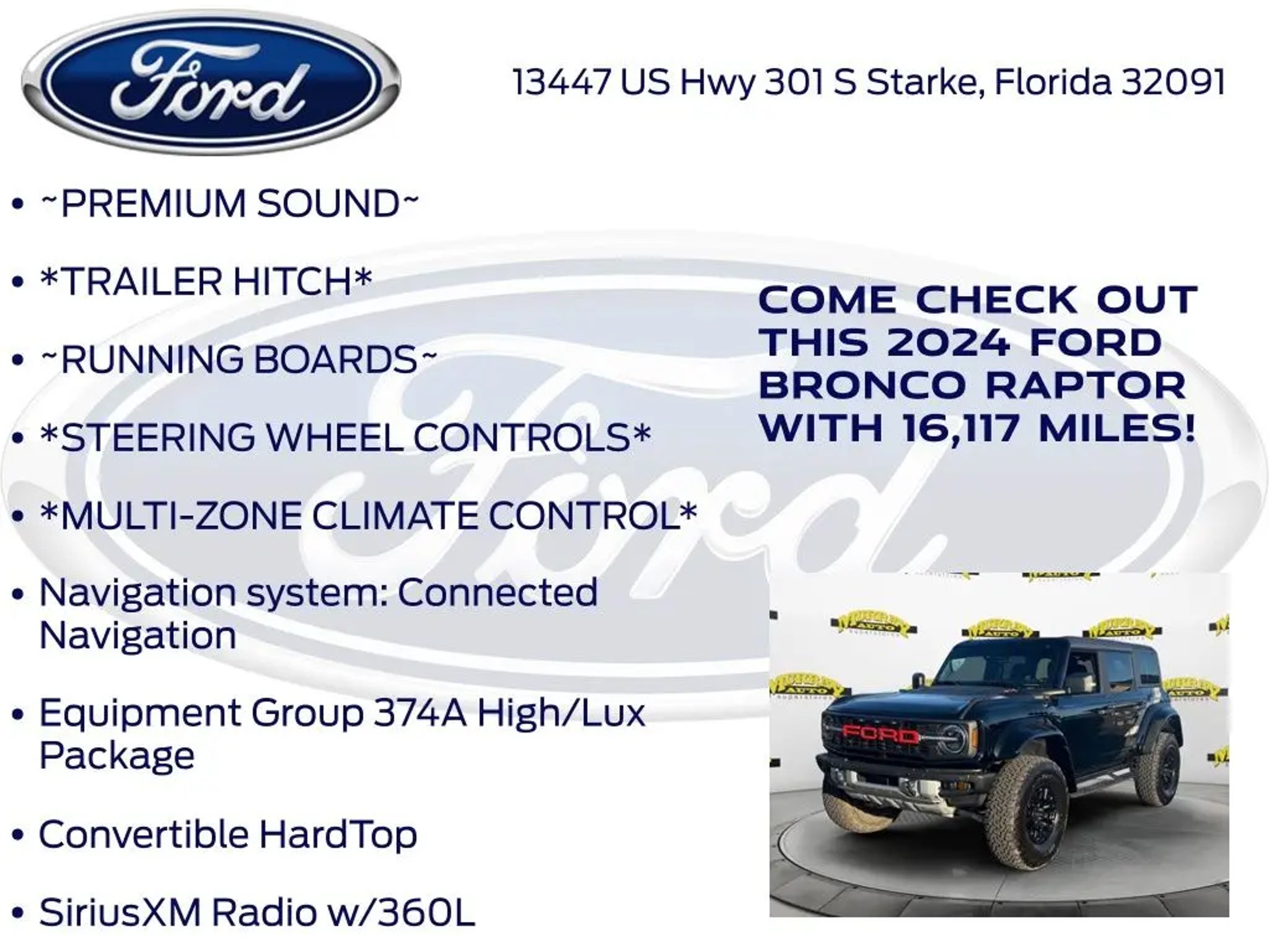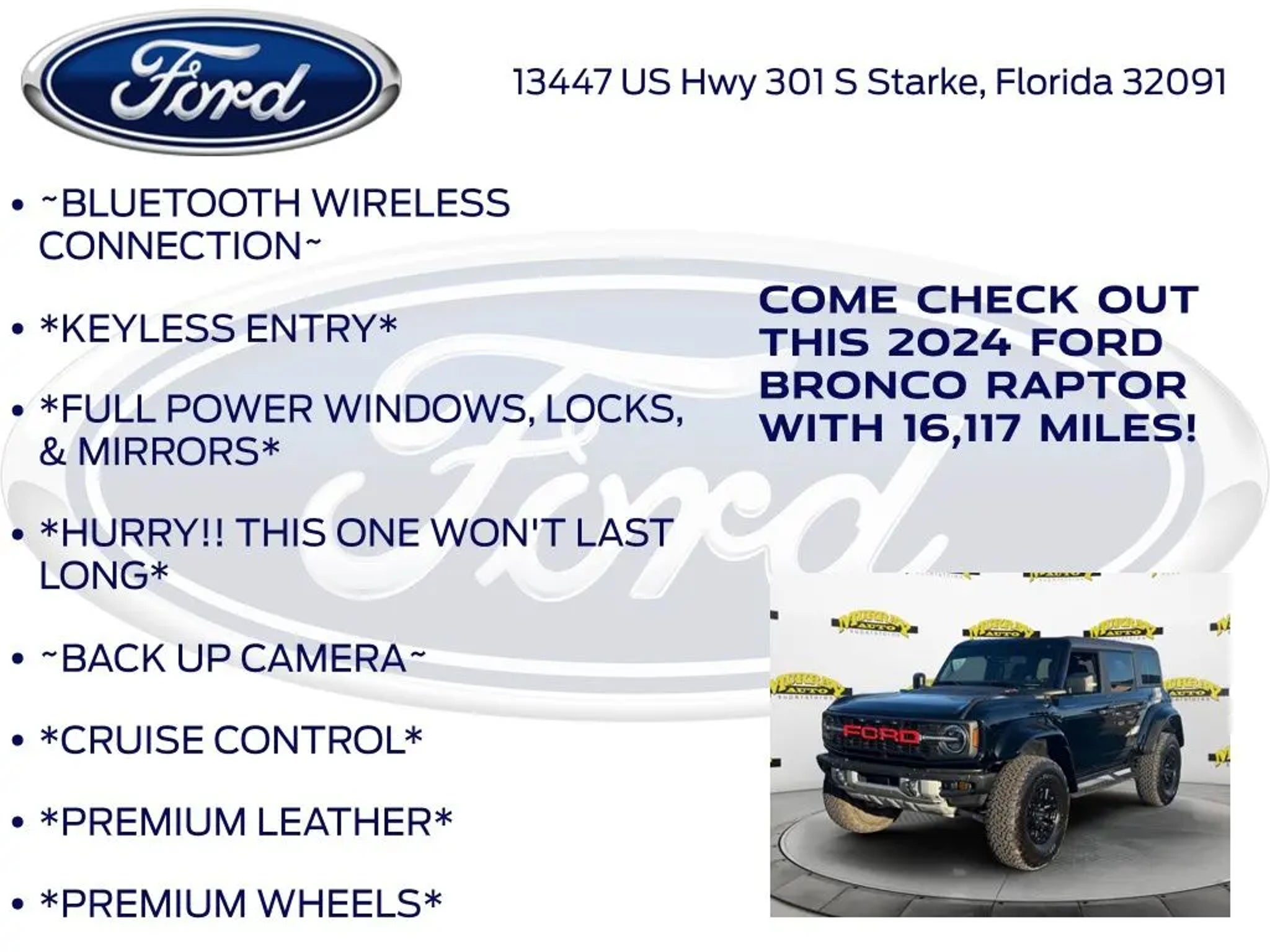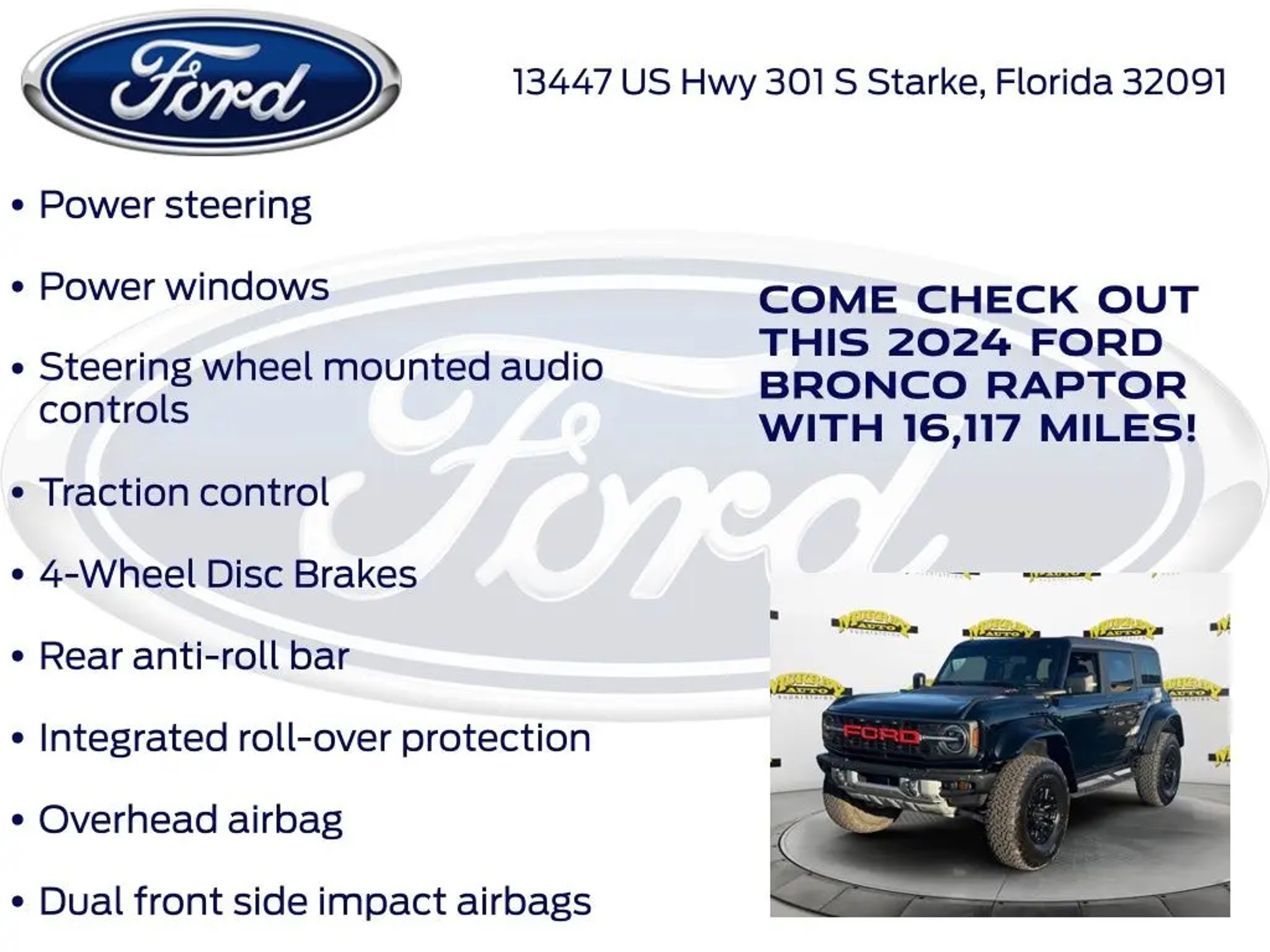 CARFAX One-Owner. Murray Ford Superstore of Starke is proud to offer this terrific-looking 2024 Ford Bronco in Shadow Black This vehicle is readily available and comes with the following Equipment Group 374A High/Lux Package, Ford Gold Certified Certified, 10 Speakers, 4-Wheel Disc Brakes, 4.7 Axle Ratio, ABS brakes, Air Conditioning, Alloy wheels, AM/FM radio: SiriusXM with 360L, Auto High-beam Headlights, Auto-dimming Rear-View mirror, Automatic temperature control, Brake assist, Compass, Connected Navigation, Convertible HardTop, Convertible roof lining, Delay-off headlights, Driver door bin, Driver vanity mirror, Dual front impact airbags, Dual front side impact airbags, Electronic Stability Control, Emergency communication system: 911 Assist, Exterior Parking Camera Rear, Front anti-roll bar, Front Bucket Seats, Front Center Armrest, Front dual zone A/C, Front fog lights, Front License Plate Bracket, Front reading lights, Front Row Top Panels & Door Storage Bags, Front wheel independent suspension, Fully automatic headlights, Garage door transmitter, Glass rear window, Heated door mirrors, Heated front seats, Heated steering wheel, Illuminated entry, Integrated roll-over protection, Leather Shift Knob, Low tire pressure warning, Marine Grade Vinyl Bucket Seats, Navigation system: Connected Navigation, Occupant sensing airbag, Outside temperature display, Overhead airbag, Overhead console, Panic alarm, Passenger door bin, Passenger vanity mirror, Power door mirrors, Power steering, Power windows, Radio data system, Radio: B&O Sound System by Bang & Olufsen, Raptor Side & Hood Graphics, Rear anti-roll bar, Rear seat center armrest, Rear window defroster, Rear window wiper, Remote keyless entry, Security system, SiriusXM Radio w/360L, Speed control, Split folding rear seat, Steering wheel mounted audio controls, SYNC 4, Tachometer, Telescoping steering wheel, Tilt steering wheel, Traction control, Trip computer, Turn signal indicator mirrors, Variably intermittent wipers, Voltmeter, and Wheels: 17 Black High Gloss-Painted Aluminum; Ford Gold Certified Details: * Transferable Warranty * Warranty Deductible: $100 * and 22,000 FordPass Rewards Points to use toward first two maintenance visits * Powertrain Limited Warranty: 84 Month/100,000 Mile (whichever comes first) from original in-service date * Roadside Assistance * Vehicle History * Limited Warranty: 12 Month/12,000 Mile (whichever comes first) after new car warranty expires or from certified purchase date * 172 Point Inspection 15 Year 150,000 mile warranty at no cost applies to all vehicles excluding Transit Vans, DRW Trucks, any SVT Models, or similar vehicles. See sales for details! All vehicles will have a $999.00 dealer fee added to the total sale price (excludes A,Z,D, and X plan customers). Taxes, tag, and title fees will be added to all vehicles in accordance with state laws of customers registering address. *** We make every effort to provide you with the most accurate, up-to-the-minute information, however it is your responsibility to verify with the Dealer that all details listed and installed options are accurate for this specific vehicle. To ensure accuracy, please contact the dealership to verify the exact options, features and programs that are included and are available for this specific vehicle prior to purchase.
