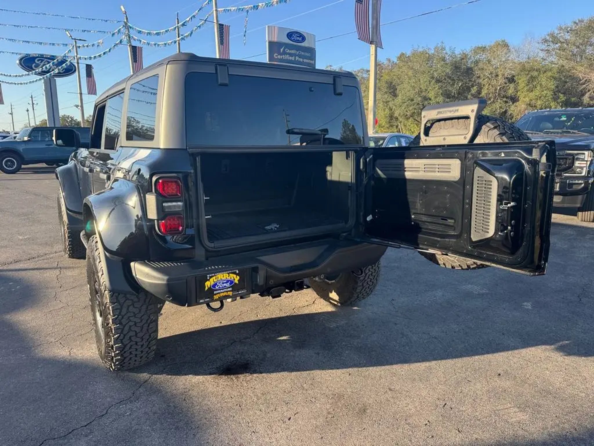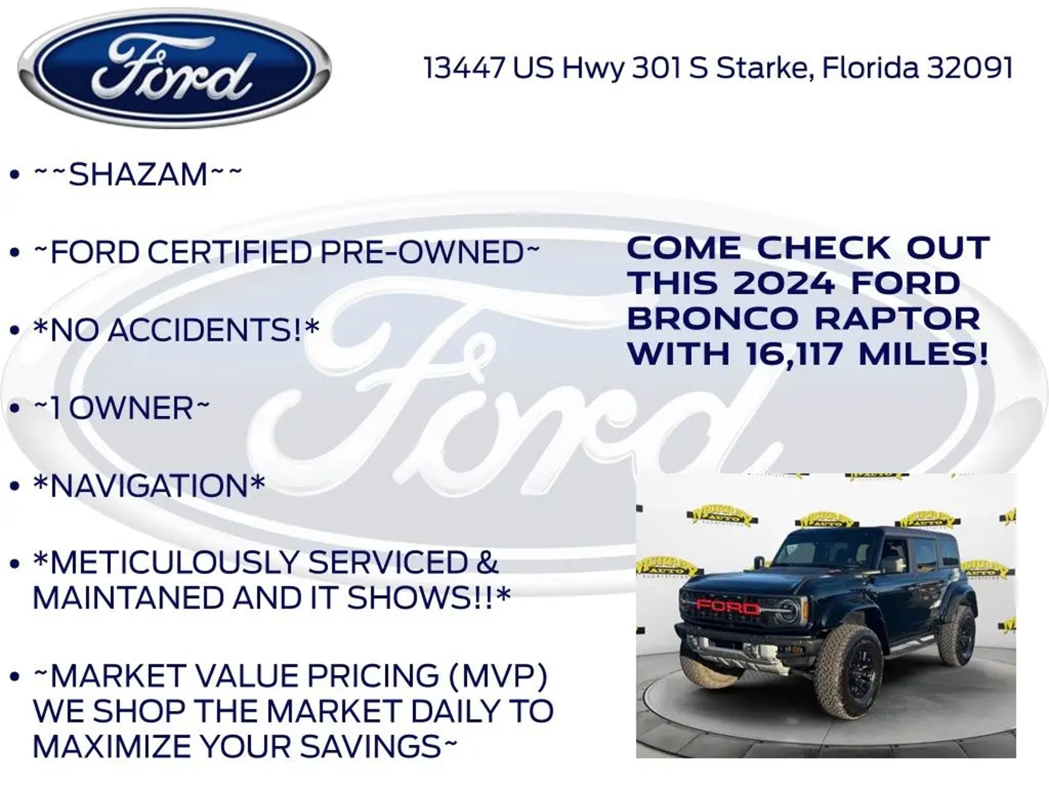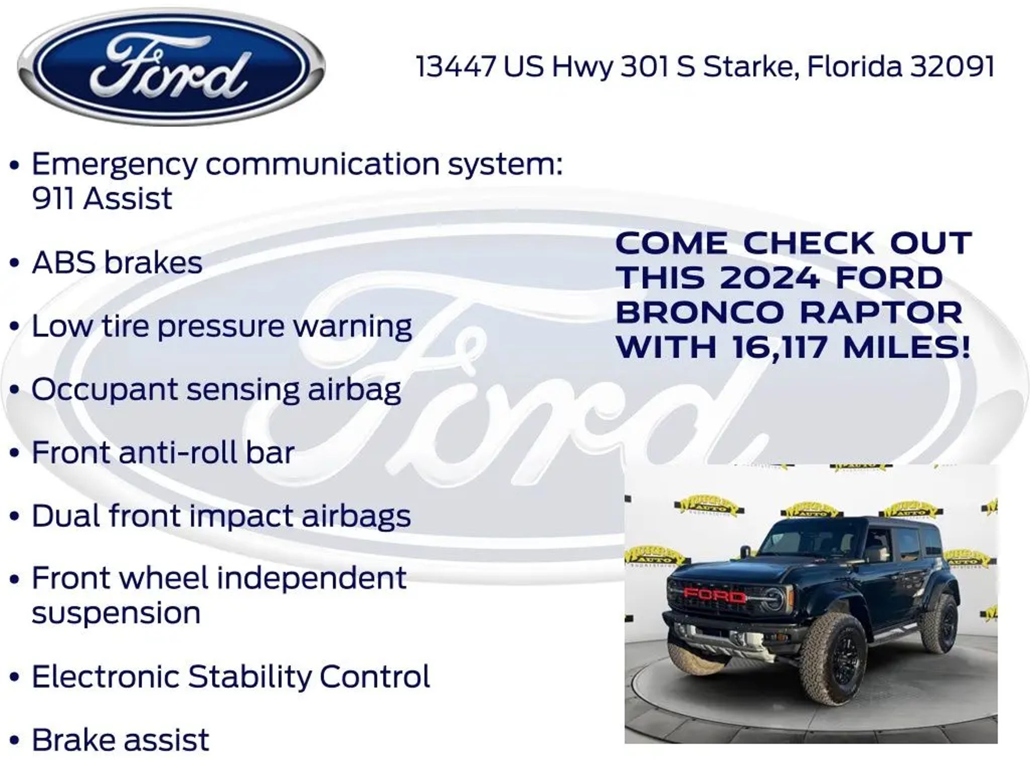 CARFAX One-Owner. Murray Ford Superstore of Starke is proud to offer this terrific-looking 2024 Ford Bronco in Shadow Black This vehicle is readily available and comes with the following Equipment Group 374A High/Lux Package, Ford Gold Certified Certified, 10 Speakers, 4-Wheel Disc Brakes, 4.7 Axle Ratio, ABS brakes, Air Conditioning, Alloy wheels, AM/FM radio: SiriusXM with 360L, Auto High-beam Headlights, Auto-dimming Rear-View mirror, Automatic temperature control, Brake assist, Compass, Connected Navigation, Convertible HardTop, Convertible roof lining, Delay-off headlights, Driver door bin, Driver vanity mirror, Dual front impact airbags, Dual front side impact airbags, Electronic Stability Control, Emergency communication system: 911 Assist, Exterior Parking Camera Rear, Front anti-roll bar, Front Bucket Seats, Front Center Armrest, Front dual zone A/C, Front fog lights, Front License Plate Bracket, Front reading lights, Front Row Top Panels & Door Storage Bags, Front wheel independent suspension, Fully automatic headlights, Garage door transmitter, Glass rear window, Heated door mirrors, Heated front seats, Heated steering wheel, Illuminated entry, Integrated roll-over protection, Leather Shift Knob, Low tire pressure warning, Marine Grade Vinyl Bucket Seats, Navigation system: Connected Navigation, Occupant sensing airbag, Outside temperature display, Overhead airbag, Overhead console, Panic alarm, Passenger door bin, Passenger vanity mirror, Power door mirrors, Power steering, Power windows, Radio data system, Radio: B&O Sound System by Bang & Olufsen, Raptor Side & Hood Graphics, Rear anti-roll bar, Rear seat center armrest, Rear window defroster, Rear window wiper, Remote keyless entry, Security system, SiriusXM Radio w/360L, Speed control, Split folding rear seat, Steering wheel mounted audio controls, SYNC 4, Tachometer, Telescoping steering wheel, Tilt steering wheel, Traction control, Trip computer, Turn signal indicator mirrors, Variably intermittent wipers, Voltmeter, and Wheels: 17 Black High Gloss-Painted Aluminum; Ford Gold Certified Details: * Transferable Warranty * Warranty Deductible: $100 * and 22,000 FordPass Rewards Points to use toward first two maintenance visits * Powertrain Limited Warranty: 84 Month/100,000 Mile (whichever comes first) from original in-service date * Roadside Assistance * Vehicle History * Limited Warranty: 12 Month/12,000 Mile (whichever comes first) after new car warranty expires or from certified purchase date * 172 Point Inspection 15 Year 150,000 mile warranty at no cost applies to all vehicles excluding Transit Vans, DRW Trucks, any SVT Models, or similar vehicles. See sales for details! All vehicles will have a $999.00 dealer fee added to the total sale price (excludes A,Z,D, and X plan customers). Taxes, tag, and title fees will be added to all vehicles in accordance with state laws of customers registering address. *** We make every effort to provide you with the most accurate, up-to-the-minute information, however it is your responsibility to verify with the Dealer that all details listed and installed options are accurate for this specific vehicle. To ensure accuracy, please contact the dealership to verify the exact options, features and programs that are included and are available for this specific vehicle prior to purchase.
