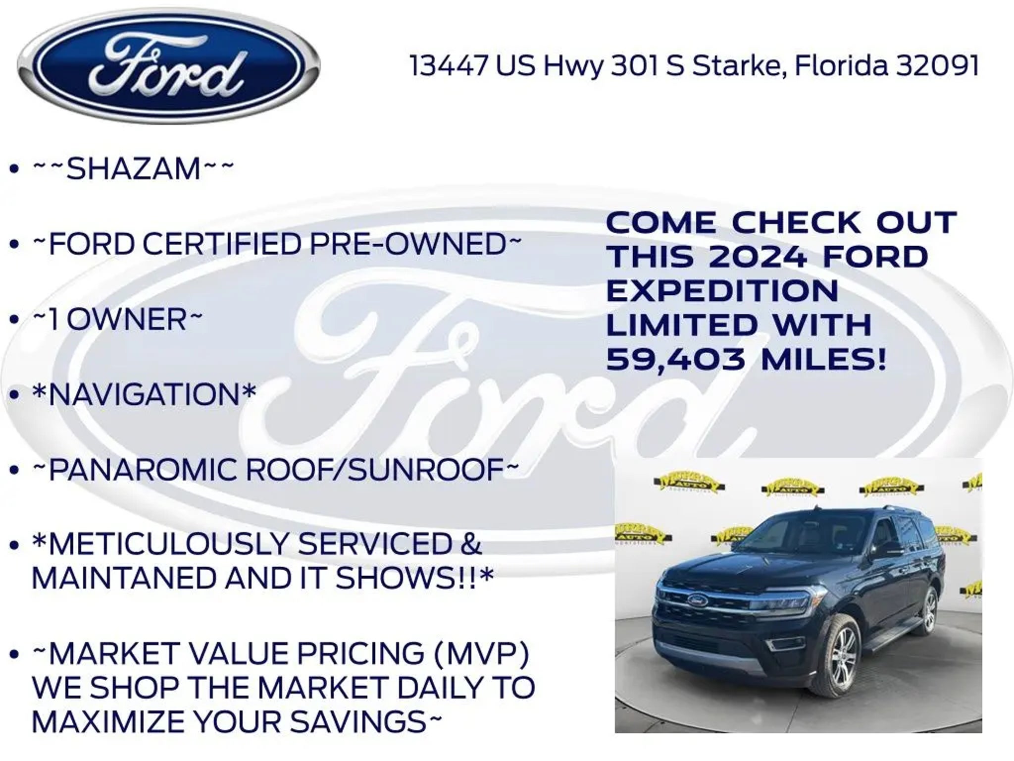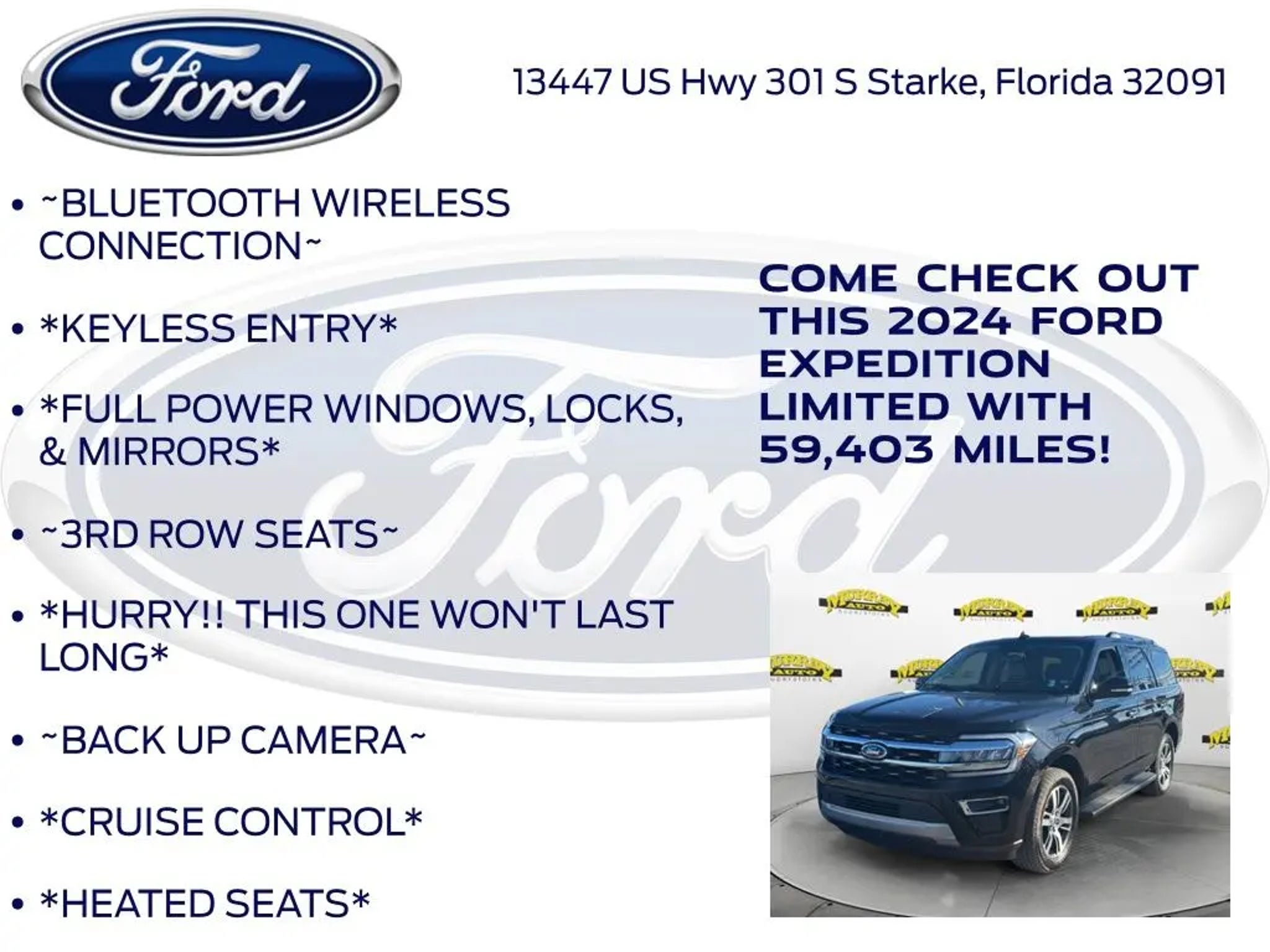 CARFAX One-Owner. Priced below KBB Fair Purchase Price! Murray Ford Superstore of Starke is pleased to offer this charming 2024 Ford Expedition in Agate Black Metallic This vehicle is readily available and comes with the following Equipment Group 301A Mid Package, Ford Gold Certified Certified, 12 Speakers, 3.31 Axle Ratio, 3rd row seats: split-bench, 4-Wheel Disc Brakes, ABS brakes, Adjustable pedals, Air Conditioning, Alloy wheels, AM/FM radio: SiriusXM with 360L, Auto High-beam Headlights, Auto-dimming door mirrors, Auto-dimming Rear-View mirror, Automatic temperature control, Brake assist, Bumpers: body-color, Compass, Delay-off headlights, Driver door bin, Driver vanity mirror, Dual front impact airbags, Dual front side impact airbags, Electronic Stability Control, Emergency communication system: SYNC 4 911 Assist, Exterior Parking Camera Rear, Four wheel independent suspension, Front anti-roll bar, Front Bucket Seats, Front Center Armrest, Front dual zone A/C, Front fog lights, Front reading lights, Fully automatic headlights, Garage door transmitter, Heated & Ventilated Leather Front Captain's Chairs, Heated door mirrors, Heated front seats, Heated rear seats, Heated steering wheel, Illuminated entry, Leather steering wheel, Low tire pressure warning, Memory seat, Navigation system: Connected Navigation, Occupant sensing airbag, Outside temperature display, Overhead airbag, Overhead console, Panic alarm, Passenger door bin, Passenger vanity mirror, Pedal memory, Power door mirrors, Power driver seat, Power Liftgate, Power moonroof, Power passenger seat, Power steering, Power windows, Radio data system, Radio: B&O Sound System by Bang & Olufsen, Rain sensing wipers, Rear air conditioning, Rear anti-roll bar, Rear reading lights, Rear window defroster, Rear window wiper, Reclining 3rd row seat, Remote keyless entry, Security system, SiriusXM w/360L, Speed control, Speed-sensing steering, Speed-Sensitive Wipers, Split folding rear seat, Spoiler, Steering wheel memory, Steering wheel mounted audio controls, SYNC 4 w/Enhanced Voice Recognition, Tachometer, Telescoping steering wheel, Tilt steering wheel, Traction control, Trip computer, Turn signal indicator mirrors, Variably intermittent wipers, Ventilated front seats, Voltmeter, and Wheels: 20 Bright Machined Aluminum; Ford Gold Certified Details: * Transferable Warranty * Powertrain Limited Warranty: 84 Month/100,000 Mile (whichever comes first) from original in-service date * and 22,000 FordPass Rewards Points to use toward first two maintenance visits * Limited Warranty: 12 Month/12,000 Mile (whichever comes first) after new car warranty expires or from certified purchase date * Warranty Deductible: $100 * 172 Point Inspection * Roadside Assistance * Vehicle History 15 Year 150,000 mile warranty at no cost applies to all vehicles excluding Transit Vans, DRW Trucks, any SVT Models, or similar vehicles. See sales for details! All vehicles will have a $999.00 dealer fee added to the total sale price (excludes A,Z,D, and X plan customers). Taxes, tag, and title fees will be added to all vehicles in accordance with state laws of customers registering address. *** We make every effort to provide you with the most accurate, up-to-the-minute information, however it is your responsibility to verify with the Dealer that all details listed and installed options are accurate for this specific vehicle. To ensure accuracy, please contact the dealership to verify the exact options, features and programs that are included and are available for this specific vehicle prior to purchase.