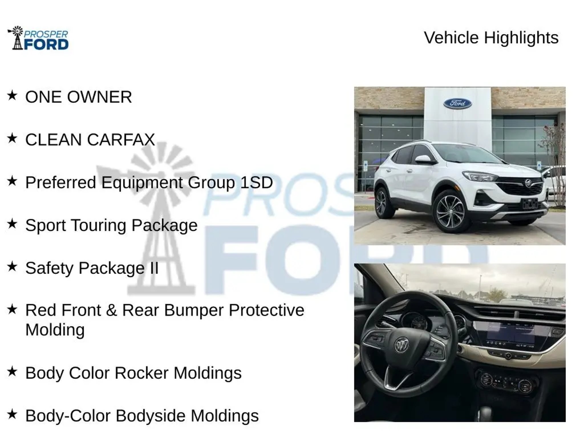 Discover the remarkable 2023 Buick Encore GX Select, a compact SUV that blends style, performance, and cutting-edge technology. With its sleek exterior, premium interior, and a host of advanced features, this Encore GX is the perfect companion for your urban adventures and weekend getaways. Standout highlights of this one-owner, clean-history vehicle include: ?? ONE OWNER ?? CLEAN CARFAX ?? Preferred Equipment Group 1SD ?? Safety Package II ?? Sport Touring Package ?? Red Front & Rear Bumper Protective Molding ?? Body Color Rocker Moldings ?? Body-Color Bodyside Moldings ?? Custom Grille with Red Accents ?? Sport Front Bumper with Red Accents ?? Sport Rear Bumper with Red Accents ?? Sport Touring Badge ?? Lane Change Alert with Side Blind Zone Alert ?? Rear Cross Traffic Alert ?? Heated Driver & Front Passenger Seats ?? 18 Aluminum Wheels with Dark Android High Gloss Inserts Powered by the efficient ECOTEC 1.2L Turbo engine and paired with a CVT transmission, this Encore GX delivers an impressive 29 city/31 highway MPG, making it an economical choice without sacrificing performance. The sport-tuned suspension and responsive steering provide a dynamic and engaging driving experience, while the Lane Change Alert and Rear Cross Traffic Alert systems help keep you and your passengers safe on the road. Step inside and you'll be greeted by a well-appointed cabin featuring an 8-inch Buick Infotainment System, wireless Apple CarPlay and Android Auto, and a premium 6-speaker audio system. The heated front seats and dual-zone automatic climate control ensure year-round comfort, while the split-folding rear seat provides the flexibility to accommodate your cargo needs. This 2023 Buick Encore GX Select is a true standout in its class, blending style, technology, and performance in a compact and versatile package. Experience the difference for yourself ? schedule a test drive today and discover why this Encore GX deserves a spot in your driveway.